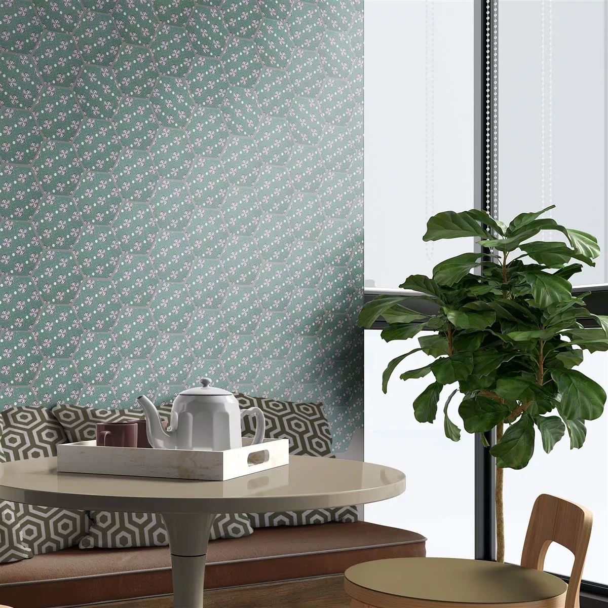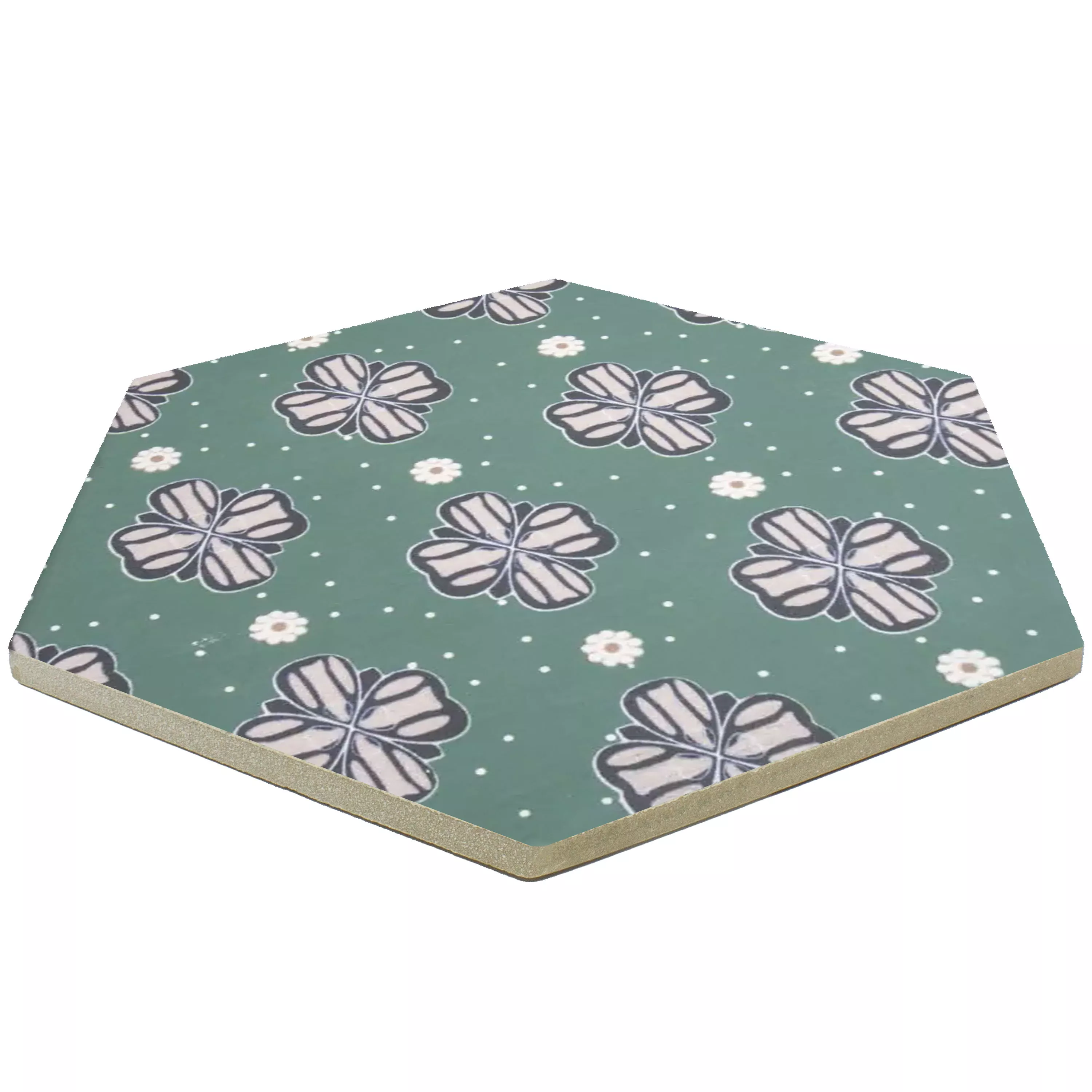 Las baldosas de gres porcelánico “Modena Hexagon Decor 7” combinan un diseño impresionante con una alta funcionalidad. Con un espesor de 10mm, son perfectos para zonas húmedas, duchas, baños, cocinas, salones y zonas interiores. La superficie mate, en un atractivo verde con adornos florales, confiere a las baldosas un aspecto elegante y atemporal.