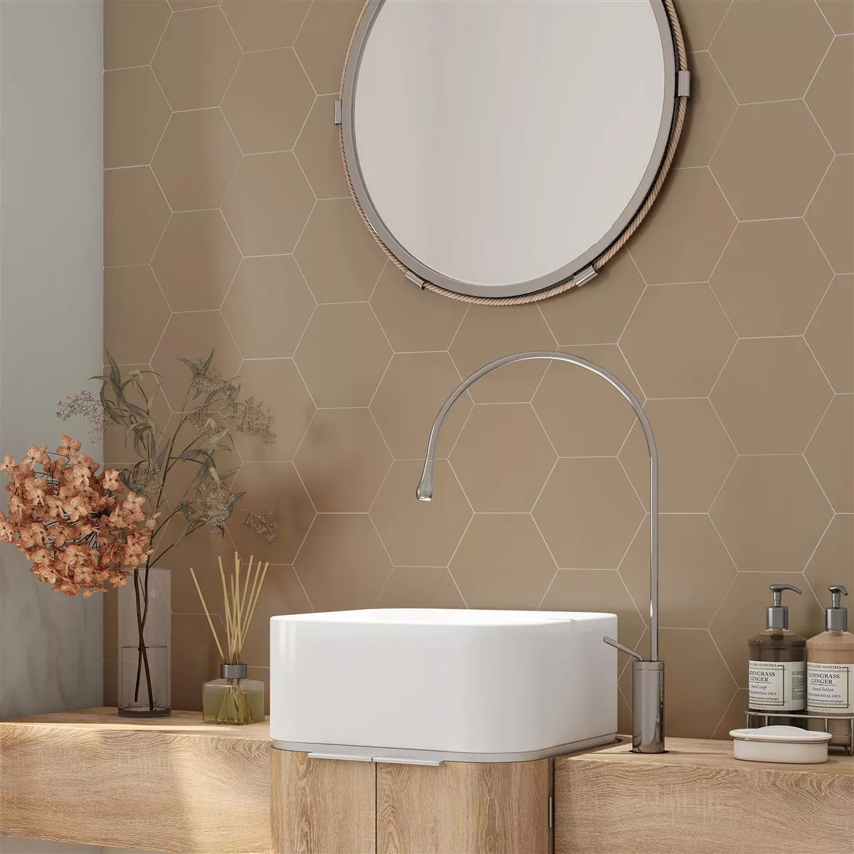 Los azulejos de gres porcelánico “Modena Hexagon Uni Sand” combinan estética y funcionalidad en uno. Con un llamativo diseño hexagonal, crean una atmósfera única en tu zona húmeda, ducha, baño, cocina, salón y zona interior. Con un grosor de 10 mm, ofrecen una base sólida, mientras que la resistencia al deslizamiento R10 garantiza la seguridad.