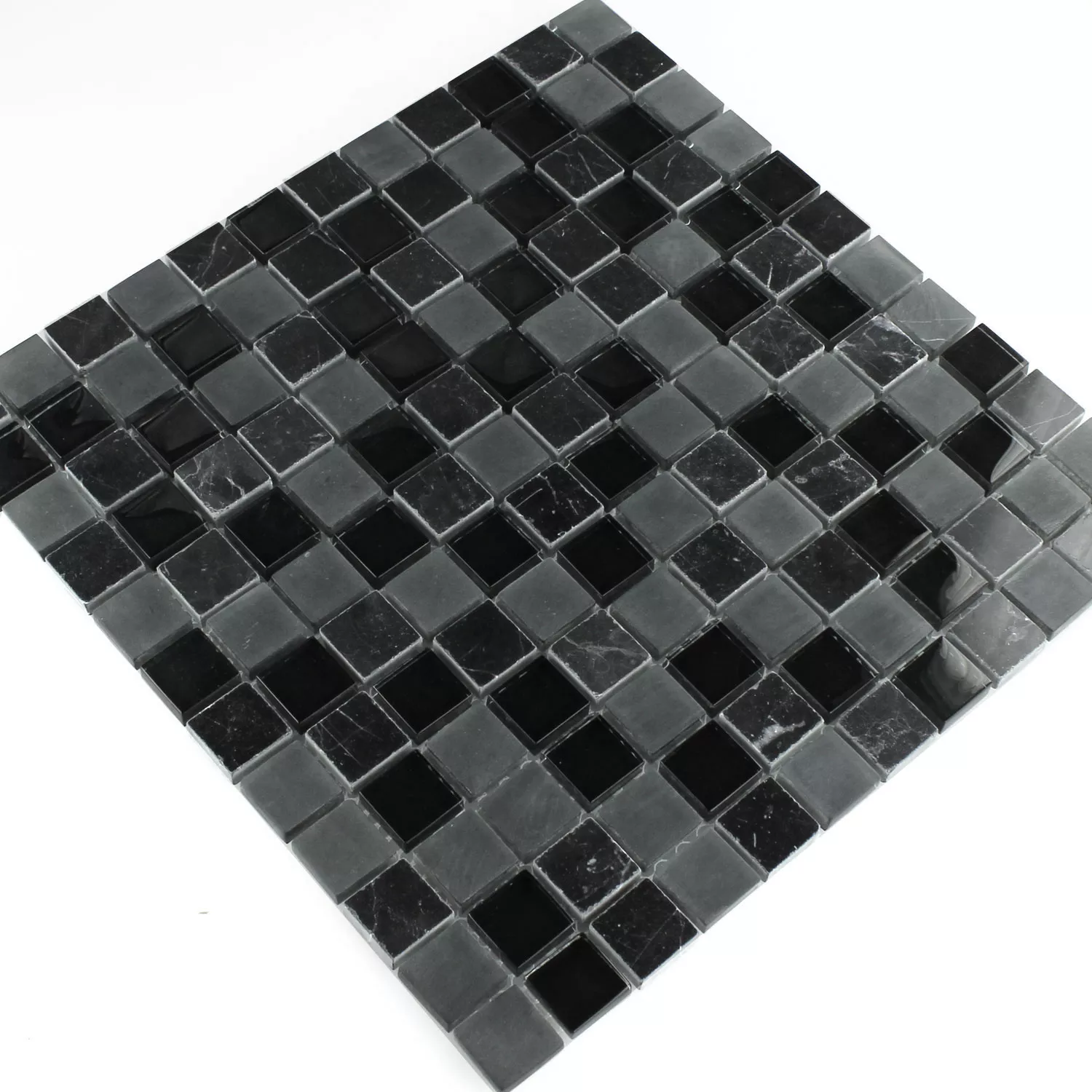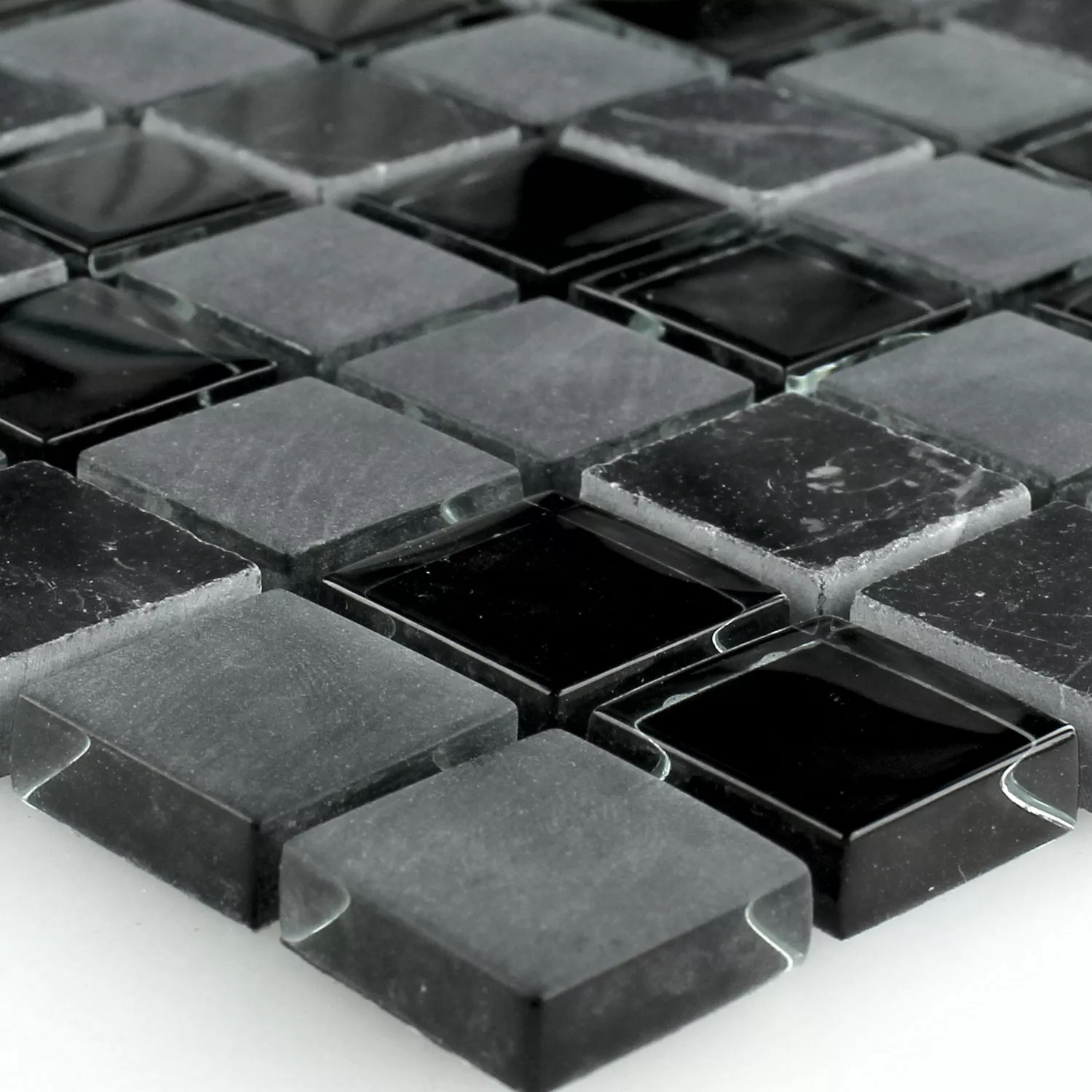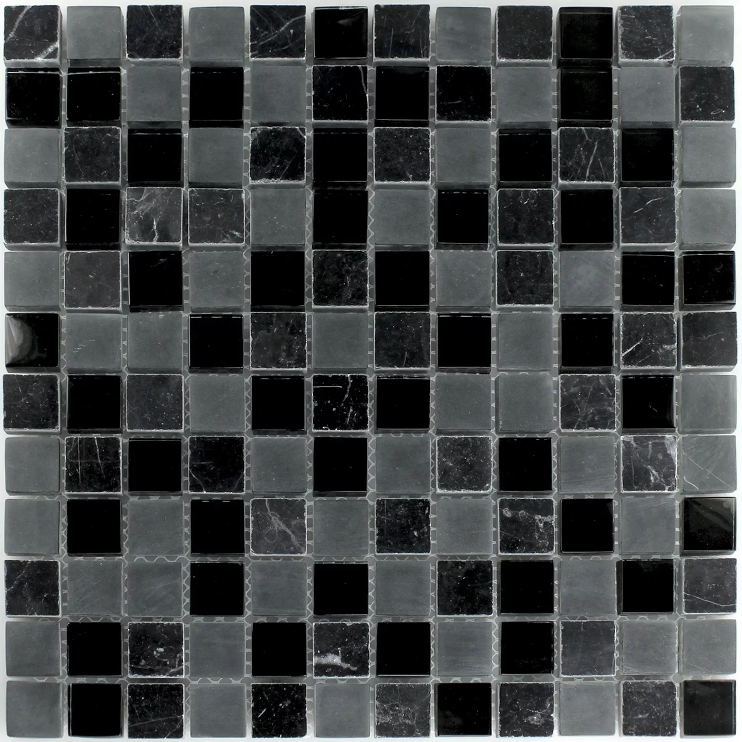 El mosaico de vidrio de mármol en mezcla de gris negro de 23x23x8 mm está pegado a una malla a modo de baldosa en la parte posterior. Las piedras de mosaicos son ideales para una opción de diseño creativo.