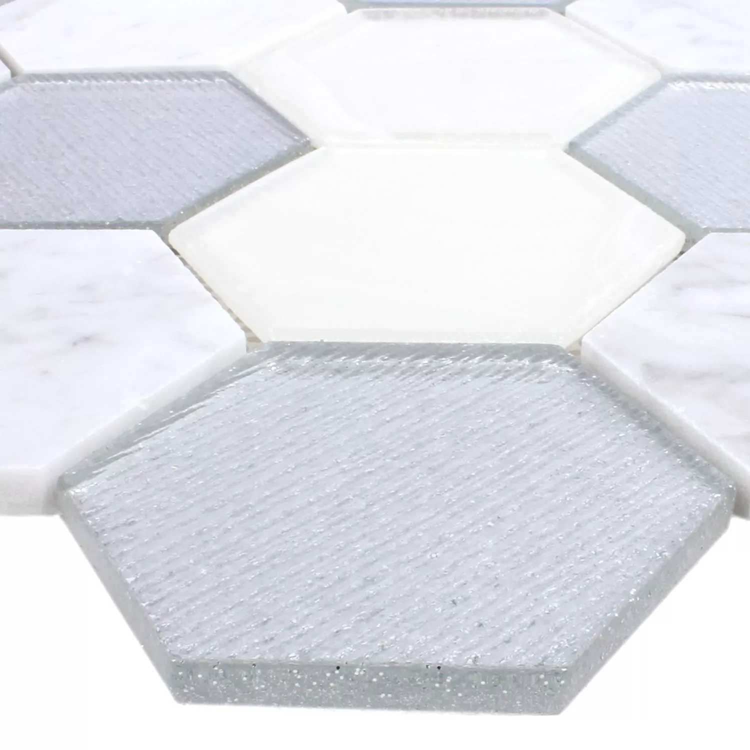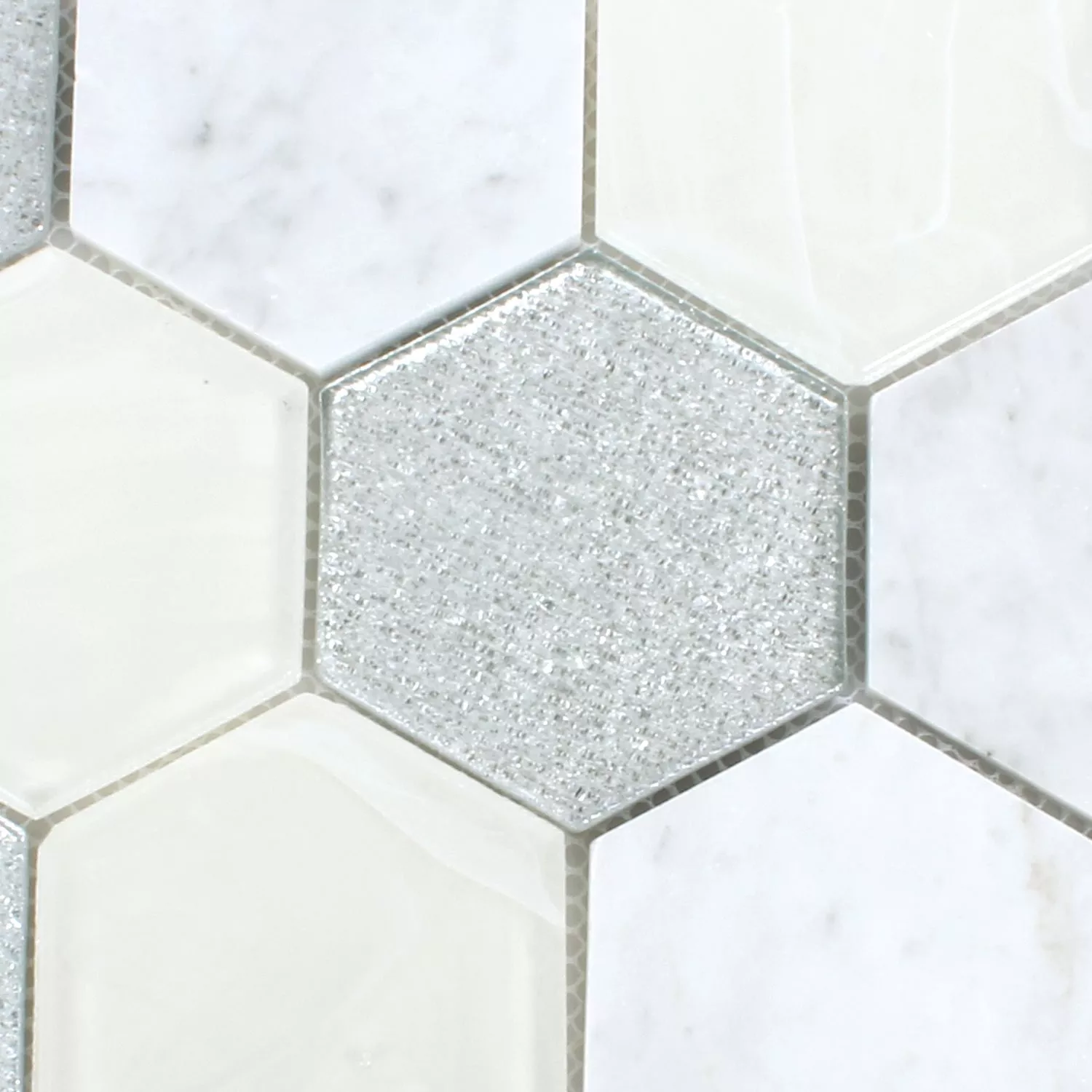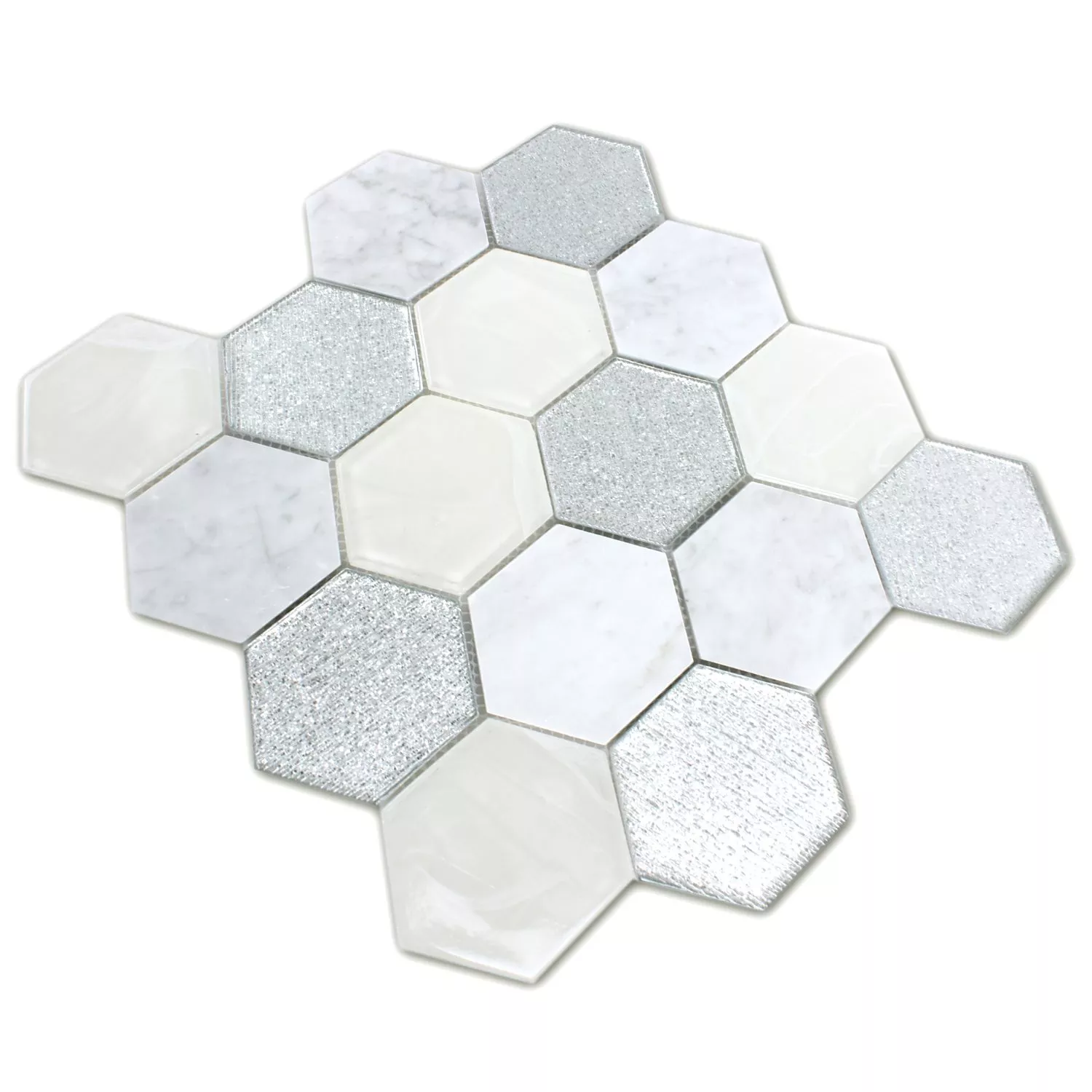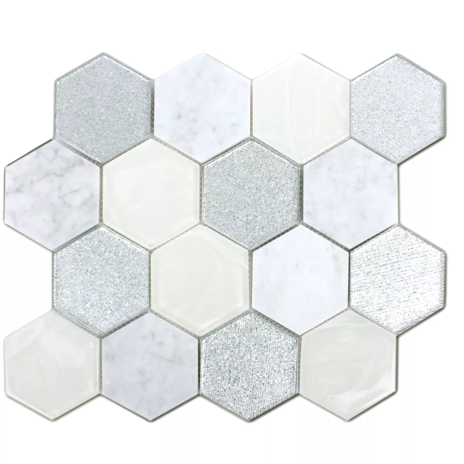 Los mosaicos tienen una superficie pulida y brillante en gris, plata y blanco. Las baldosas de nido de abeja están hechas de piedra natural y vidrio. También se pueden utilizar en interiores y exteriores. Los mosaicos también se pueden utilizar en zonas húmedas. El formato se llama hexágono y el tamaño de la piedra es de 73mm. Las dimensiones de la alfombrilla son 26,5x30,5 cm y el grosor es de 8 mm. Las piedras se pueden colocar juntas y tú decides qué forma deben tomar los mosaicos. Cuando los mosaicos se colocan juntos, se crea un patrón variado y hermoso, que es único. Debido a la superficie brillante, los azulejos no solo se ven de alta calidad, sino que también son muy elegantes y hacen que todas las habitaciones donde se instalaron se vean más brillantes y amigables. Como también se pueden instalar en el exterior, también son una gran adición a los patios.