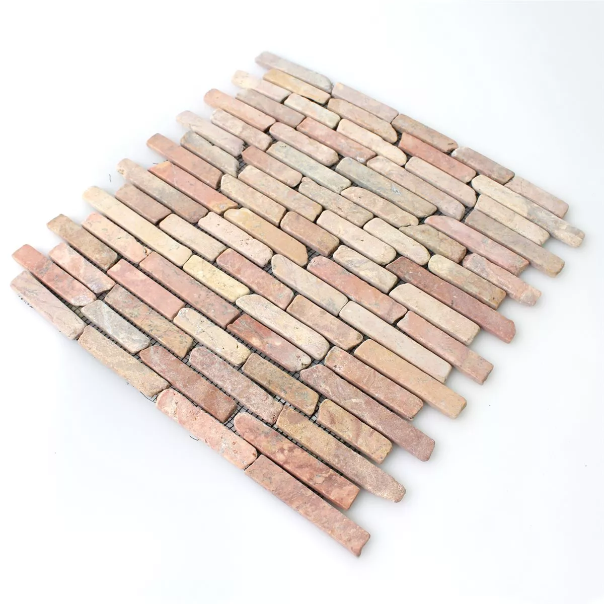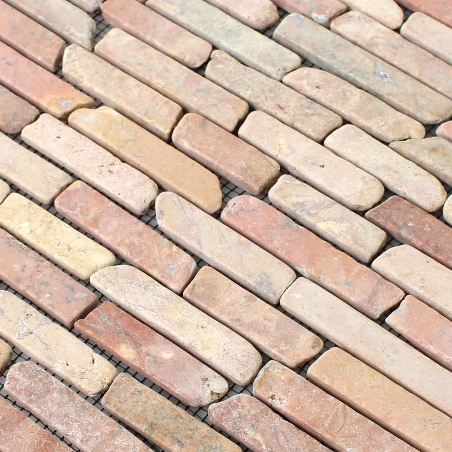 Los mosaicos de alta calidad de la serie Bali Bricks están hechos de mármol real. Por ello, estas baldosas de piedra natural aportan un toque de elegancia y lujo a todas las estancias de la casa. El mosaico de mármol fino se voltea para que la superficie de estos mosaicos luzca muy natural. En cuanto al color, estas baldosas de piedra natural ofrecen una vista muy atractiva visualmente, ya que el mosaico de mármol noble se compone de diferentes tonalidades. La serie Bali Bricks inspira con tonos rojos suaves y blanco brillante. Este modelo es una mezcla de los mosaicos Rosso Cream y Bianco, por lo que los mosaicos Bali Bricks también pueden combinarse perfectamente con el resto de losetas de piedra natural. Las habitaciones más grandes, en particular, se pueden decorar inteligentemente con los azulejos de diferentes colores.