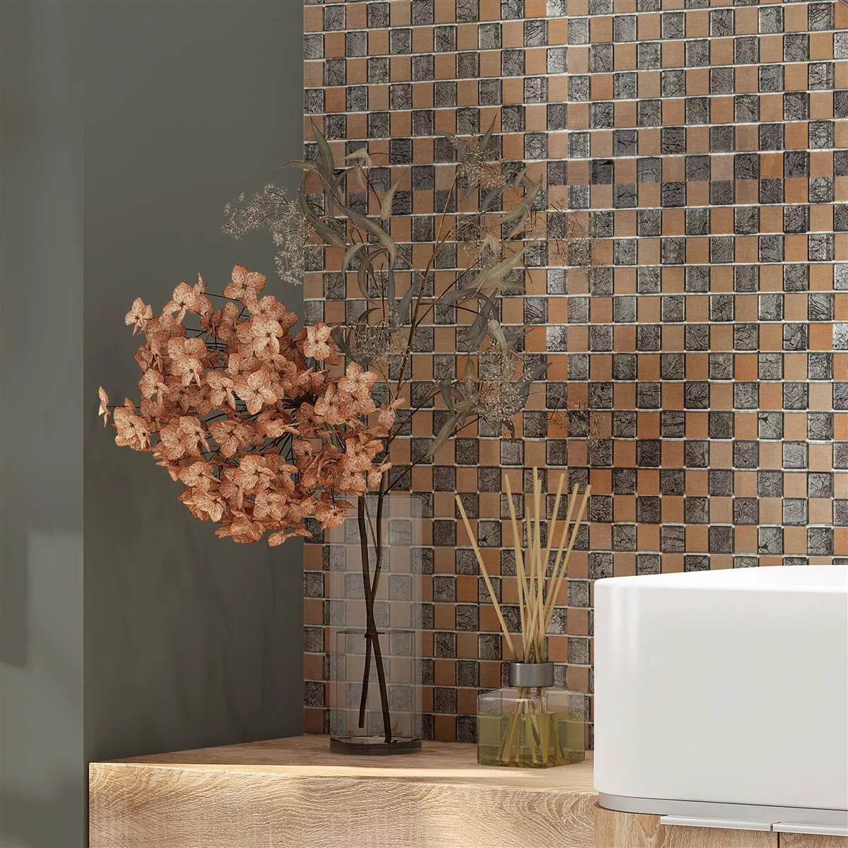 Los mosaicos gris cobrizo de Eldorien añaden un toque de sofisticación y elegancia a tus estancias. La combinación de gris y cobre crea un contraste elegante que aporta un toque moderno.