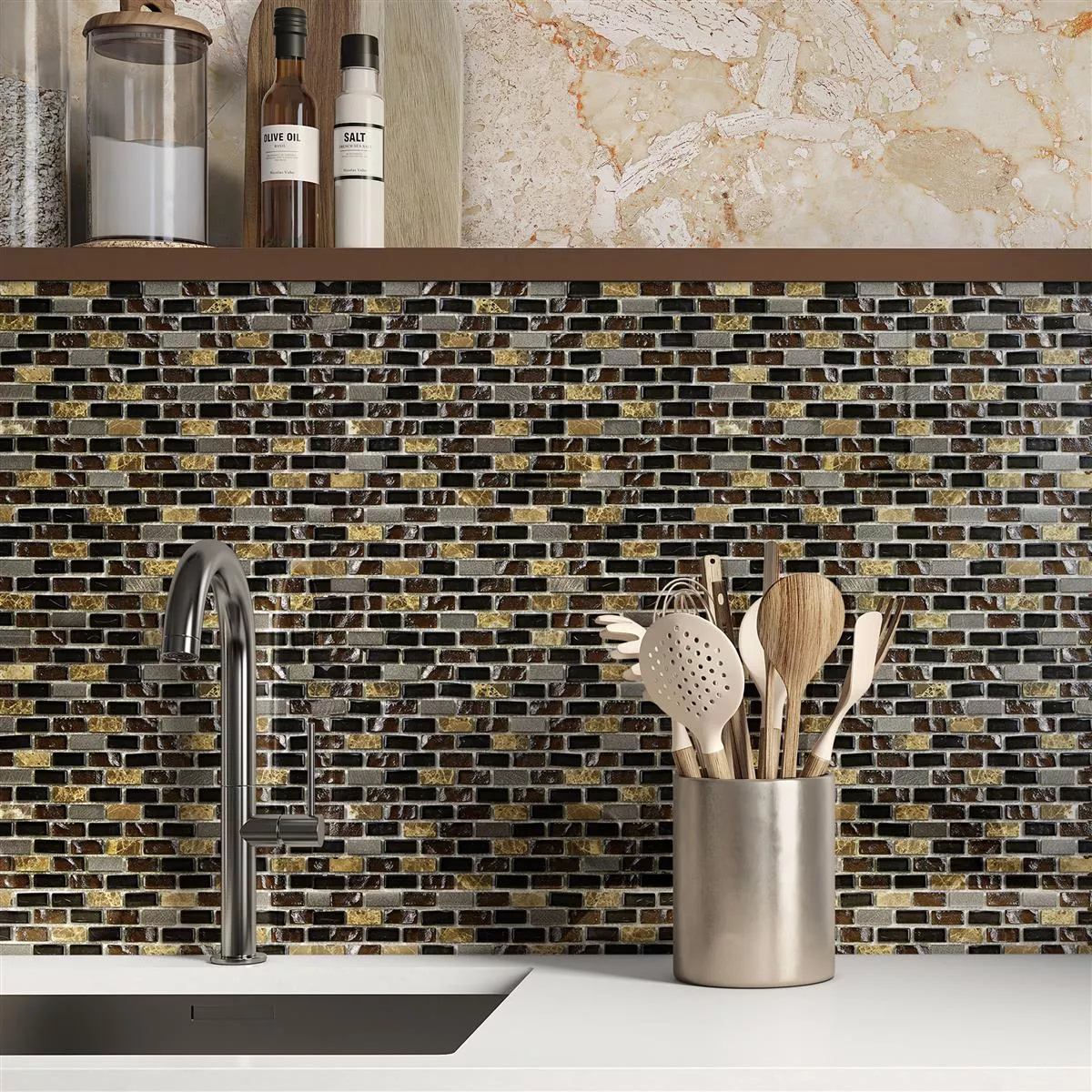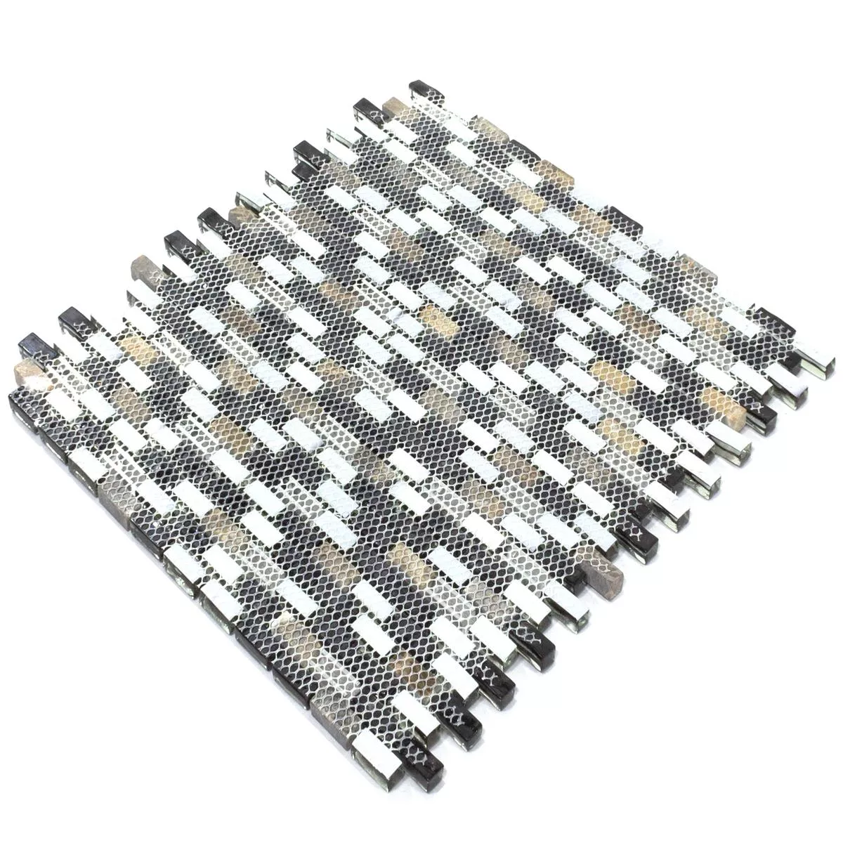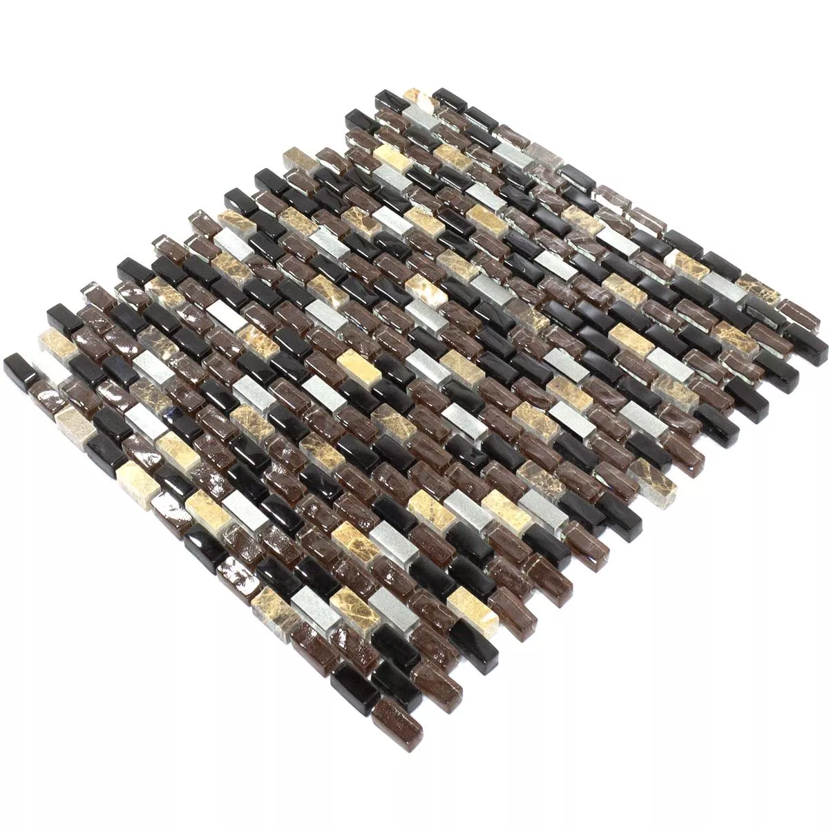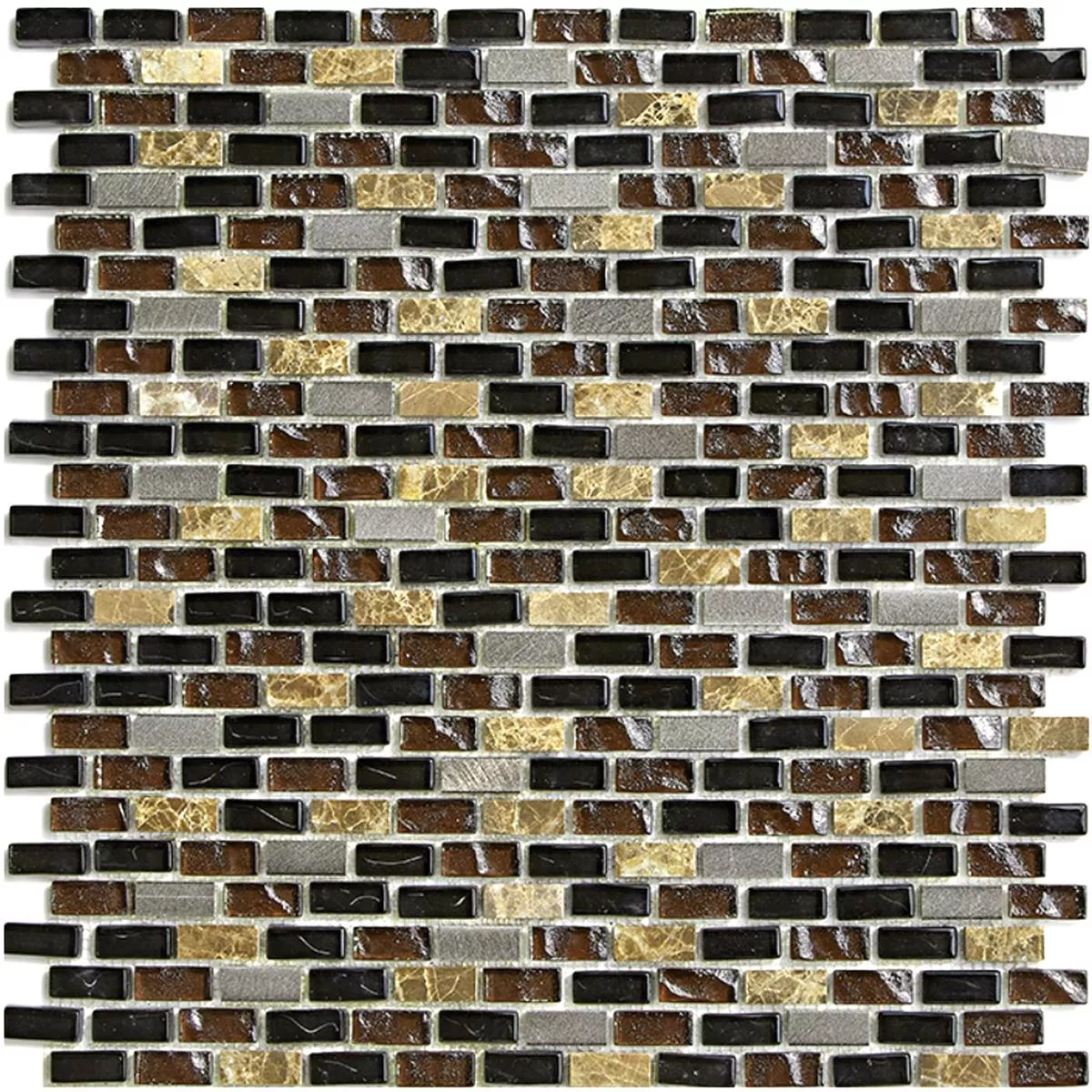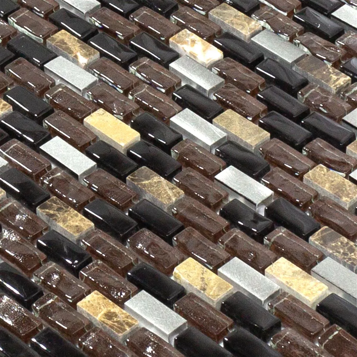 Sumérgete en la sofisticada elegancia con los mosaicos de vidrio, mármol y aluminio Patterson Brown Mix. La atrevida combinación de negro, plata y marrón, combinada con una variada superficie mate y brillante, crea una apariencia moderna. Estos mosaicos, fabricados en aluminio, mármol, metal y vidrio, ofrecen no sólo sofisticación visual sino también una sofisticada combinación de materiales.