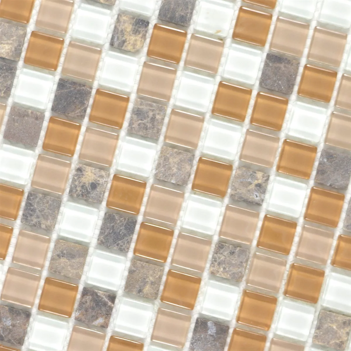 Los mosaicos de piedra natural de vidrio Zekova en la variante de color beige marrón blanco se componen alternativamente de mármol y vidrio. El mosaico de piedra natural de vidrio Zekova tiene un tamaño de piedra de 15 x 15 mm. Además, las piedras tienen alternativamente una superficie mate y brillante.