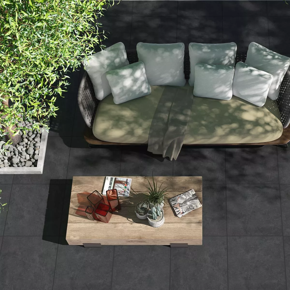 Dale a tu zona exterior un aspecto moderno y elegante con las baldosas para terraza de gres porcelánico Petersburgo con aspecto de hormigón antracita. Estas baldosas de alta calidad son la opción ideal para patios, balcones, pasillos y muchas otras aplicaciones al aire libre. Con su tamaño cuadrado de 60 x 60 cm y un grosor de 20 mm, ofrecen no sólo una solución elegante sino también robusta.