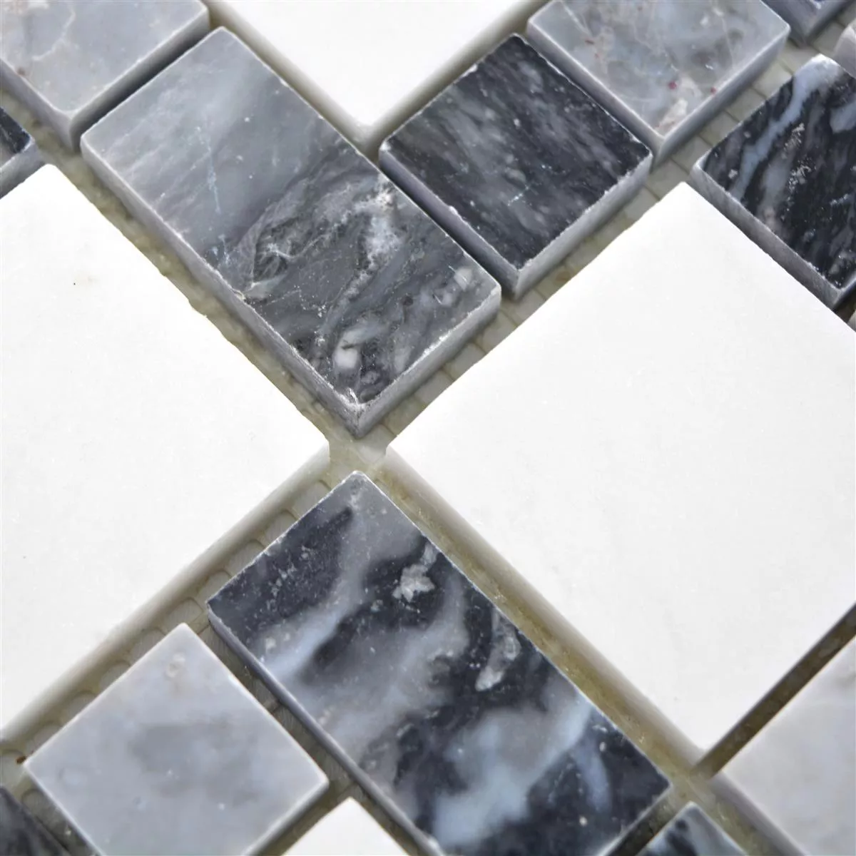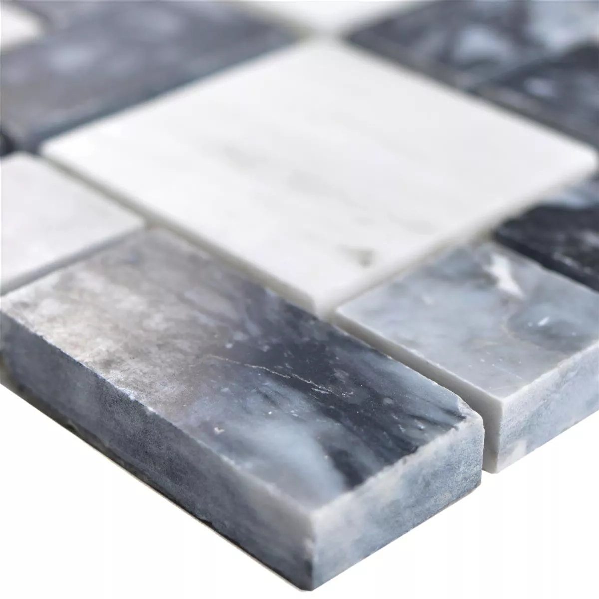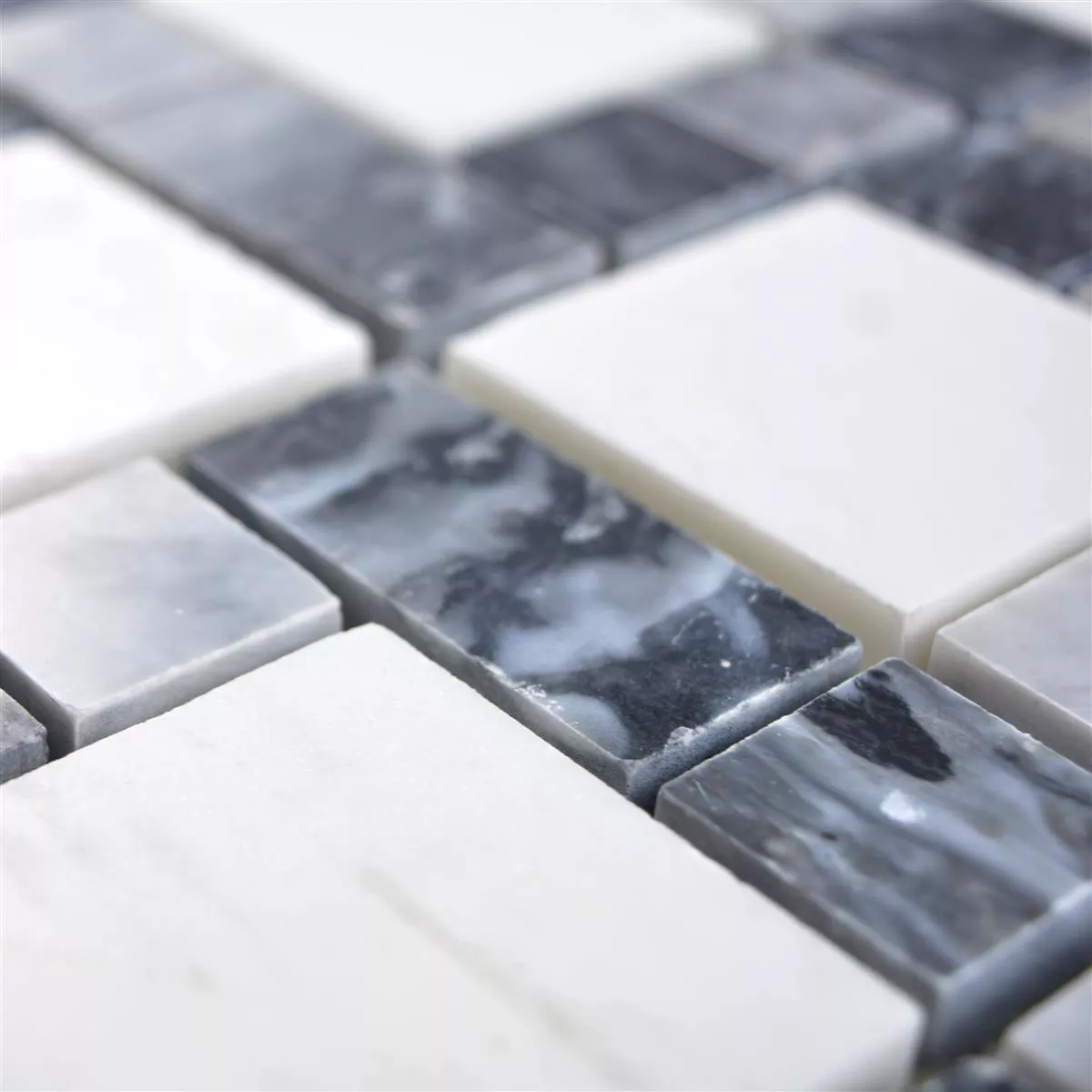 El azulejo de piedra natural de mármol Córdoba en color negro gris blanco ofrece un aspecto noble. Las baldosas de piedra natural son atemporales y se consideran muy fáciles de cuidar.