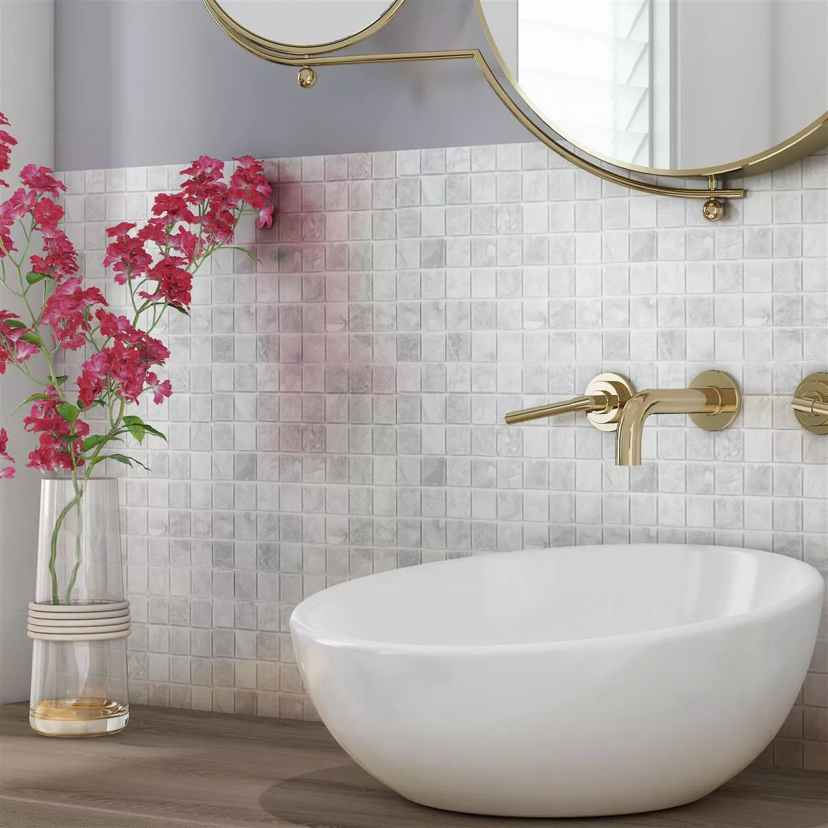 Los mosaicos blancos Venantius de mármol y piedra natural confieren a su baño una elegancia atemporal y crean un ambiente agradable y luminoso. Estos azulejos no sólo son aptos para el baño, sino también para zonas húmedas, duchas y zonas exteriores.