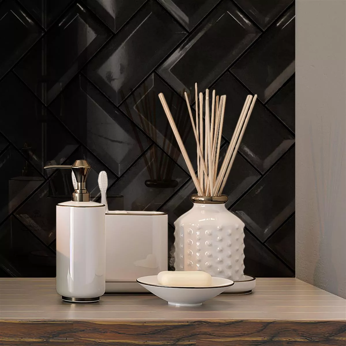 Los revestimientos Metro "Heliopolis Facette Black" aportan el encanto de la elegancia clásica a su hogar. El paquete de 1 m² contiene 88 baldosas de gres esmaltado no rectificado en formato rectangular (7,5x15 cm), que impresionan por una superficie brillante y un espesor de 10 mm.