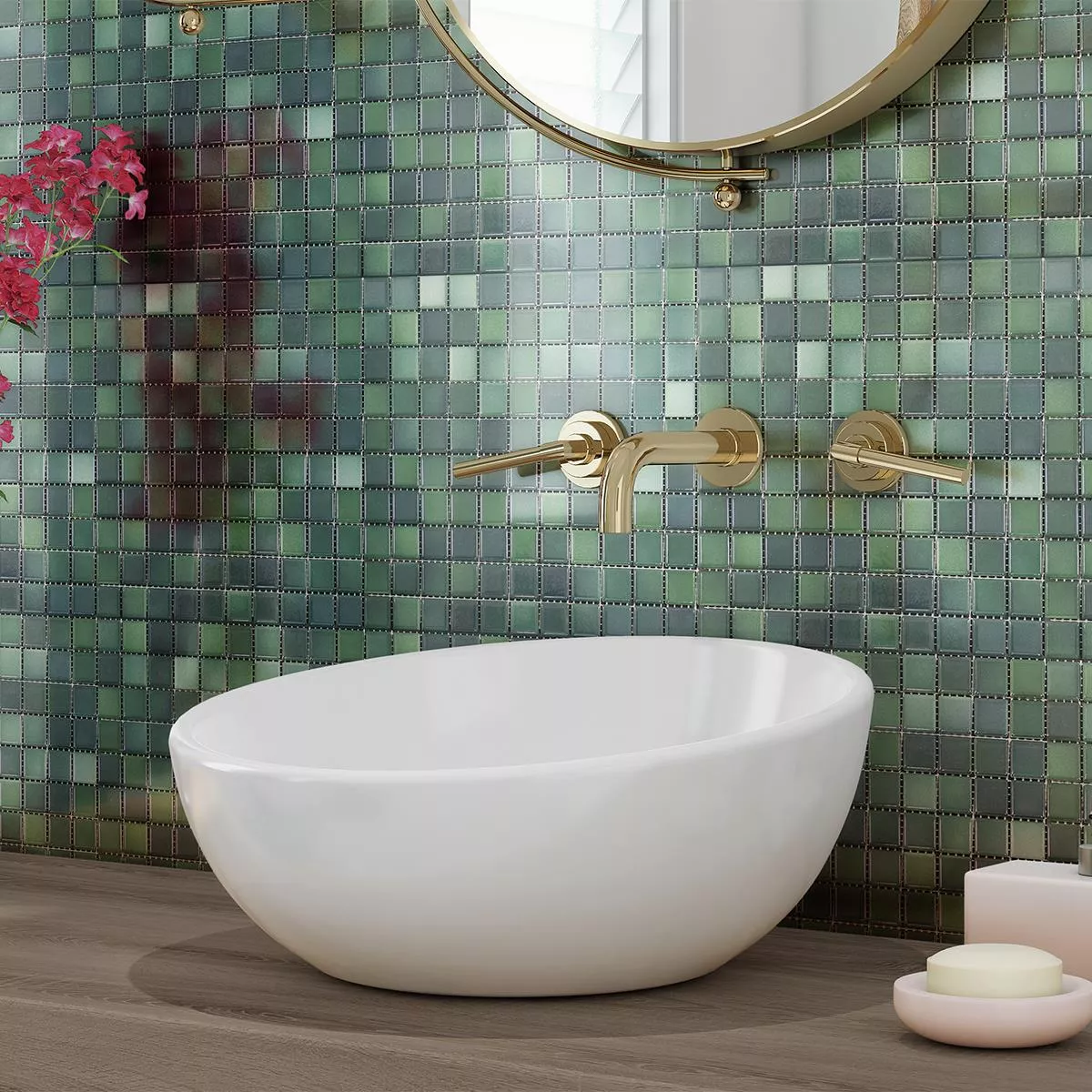 El mosaico cerámico Galleria en una refrescante mezcla de verdes aporta un toque único a sus habitaciones con su elegante aspecto metálico y su superficie mate. Con el tamaño de la piedra de 23 x 23 mm y la alfombra de baldosas de 29,7 x 29,7 cm, que ya está pegada a una malla lista para su instalación, la instalación tanto en paredes como en suelos se convierte en una tarea sencilla y precisa.