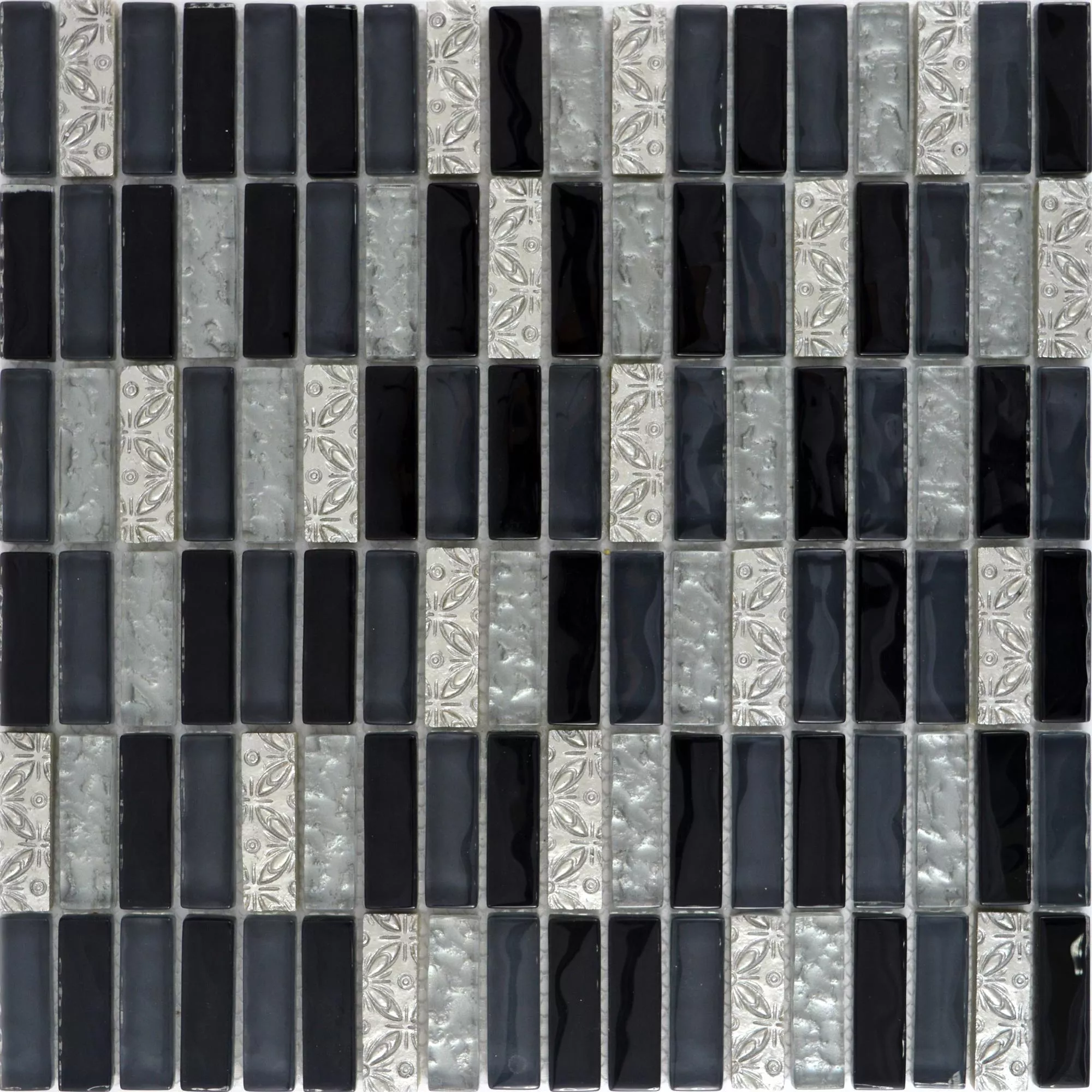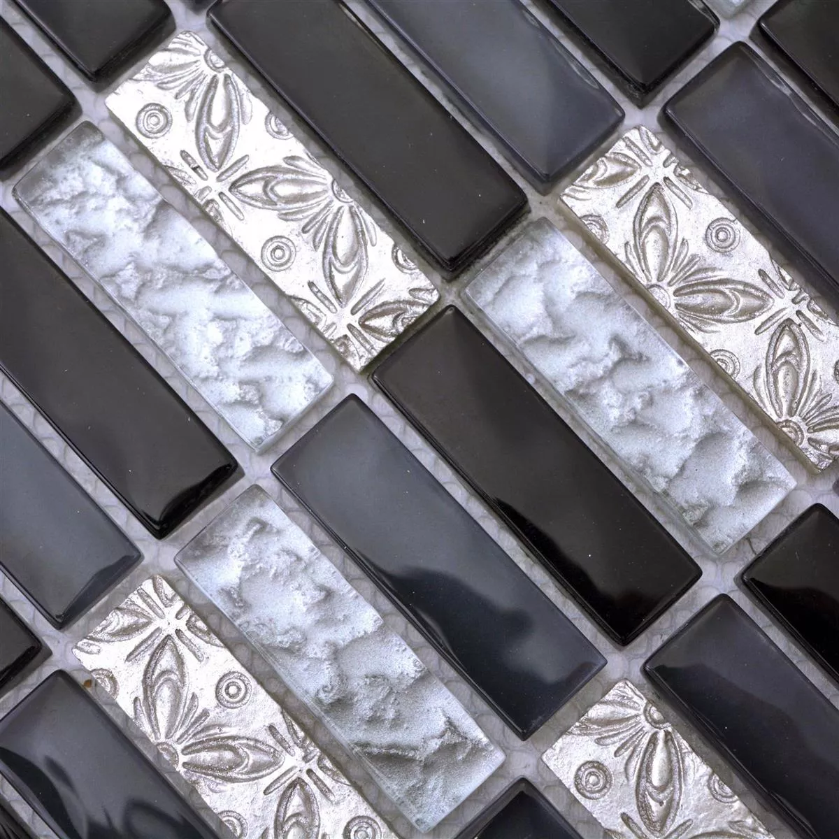 Algunas de las baldosas pequeñas están decoradas con un patrón. Los azulejos plateados muestran flores y círculos. Tanto el patrón como el color claro de estos azulejos relajan la impresión general de los mosaicos. Los elementos plateados contrastan con los azulejos negros, que también forman parte del mosaico.