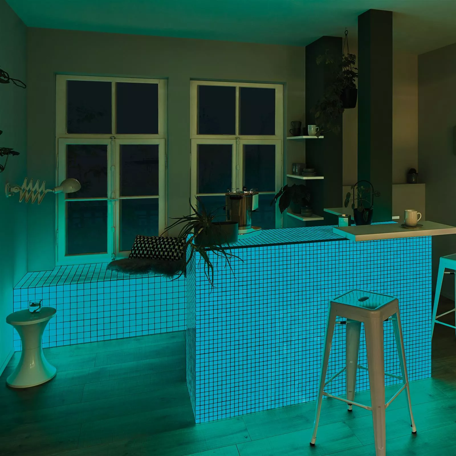 Con los mosaicos de vidrio Destiny Neon, una luz maravillosa entra en la oscuridad. Estas son baldosas autoluminosas. Durante el día se mantienen verde-azulados o también llamados verde botella. Por la noche brillan de color amarillo verdoso y aportan una luz suave a la habitación. La luminosidad de las baldosas se mantiene durante varias horas, siempre que la luz del sol o la luz de una lámpara haya llegado previamente a las baldosas.