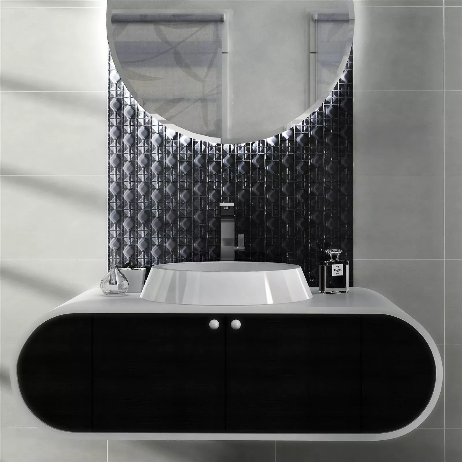 Hoy en día, la tendencia es cada vez más hacia las baldosas de gran formato. Los mosaicos de vidrio también ofrecen sus propias opciones de diseño y aplicación. Los mosaicos de vidrio no tienen que colocarse sobre un área grande. A menudo solo quieren llamar la atención o establecer acentos hábiles. Aquí la imaginación no tiene límites, con el mosaico de vidrio 3D Nokta Black Grey puedes crear divertidos contrastes y toques de color en superficies más neutras. El mosaico también se puede usar para enfatizar específicamente ciertos elementos.