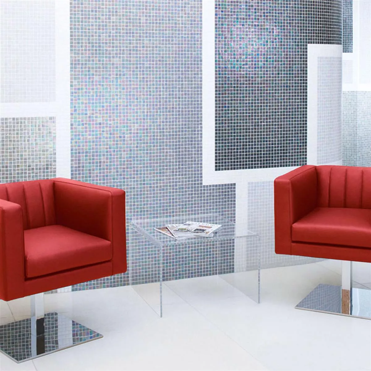 Gracias a su flexibilidad, el mosaico de vidrio brillante se puede utilizar en diversas estancias y áreas, como la sala de estar, la cocina, el baño, el invernadero, el lavadero, el patio y el pasillo. También es ideal para su uso en locales comerciales y garajes.