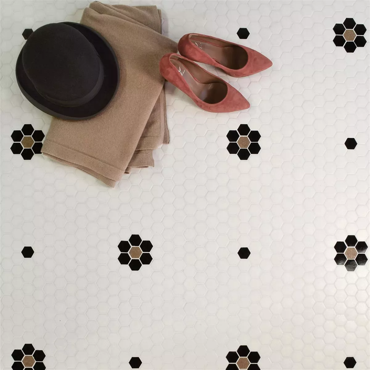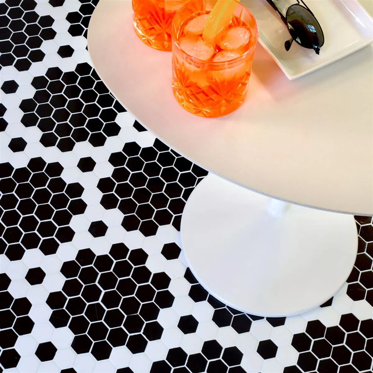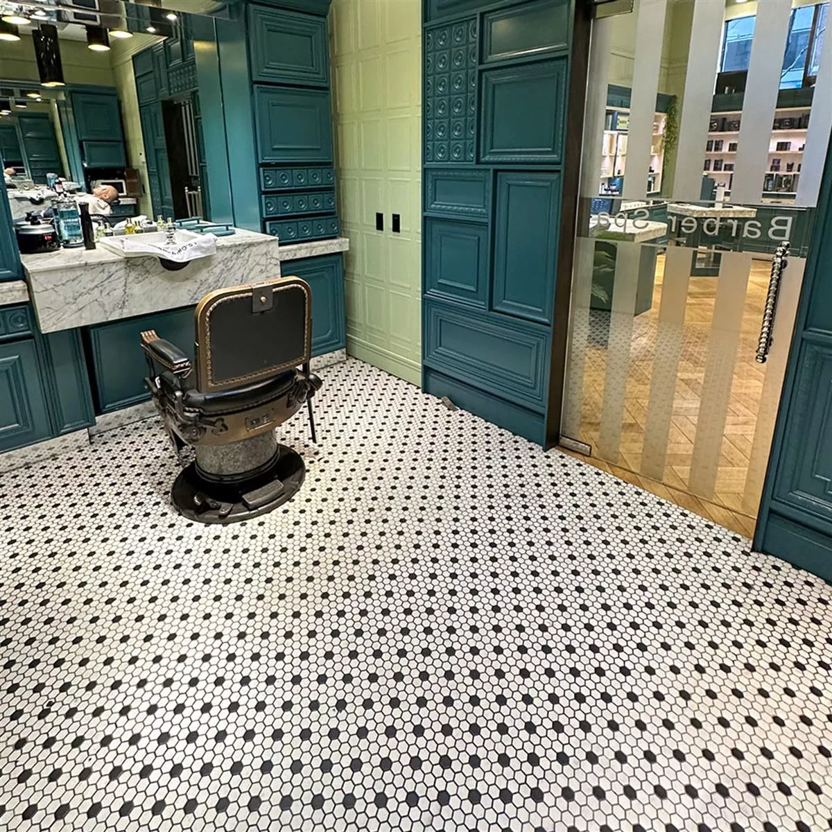 Los mosaicos hexagonales son aptos no solo para interiores, como salones o baños, sino también para exteriores. Su resistencia a las heladas los hace ideales para paredes de garajes o el suelo de duchas exteriores. Gracias a su resistencia al agua y al agua, son ideales para paredes y suelos de duchas, salpicaderos de baños y, por supuesto, piscinas.