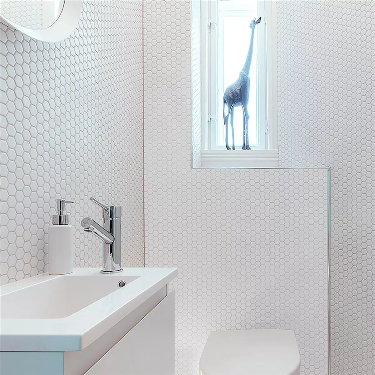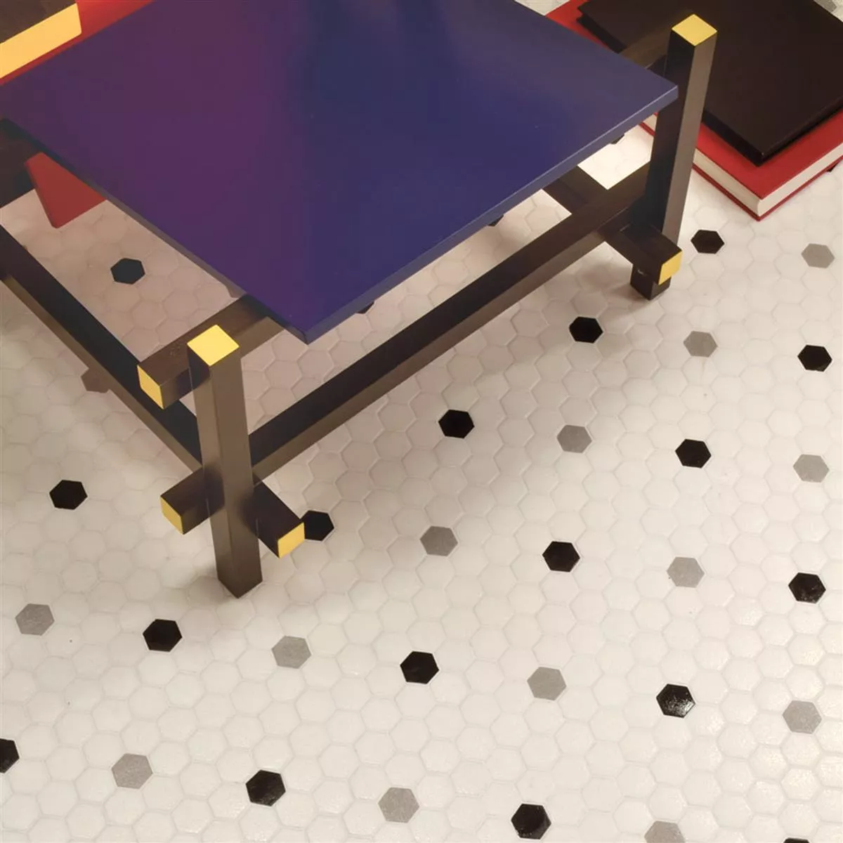 Los mosaicos de la serie Hexagonal presentan un acabado mate y una alta resistencia al deslizamiento. Además, son especialmente respetuosos con el medio ambiente, ya que están fabricados con hasta un 59 % de vidrio reciclado. El reverso de cada mosaico está adherido a una malla de poliuretano, lo que facilita su instalación y garantiza una durabilidad excepcional.