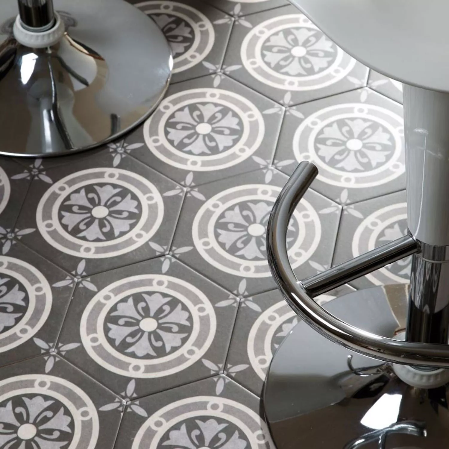 Las modernas baldosas hidráulicas con el ingenioso diseño Hexagon Alicante deleitan a grandes y pequeños por igual con un delicado tono gris y muchos patrones diferentes en los hexágonos de las baldosas del suelo. Los azulejos de pared en diferentes tonos de gris se pueden combinar idealmente con estos azulejos. Las modernas baldosas hexagonales evocan un momento emocionante en cada habitación, que fascinará a todos los miembros de la familia durante muchas décadas. Las finas baldosas hidráulicas con el moderno aspecto hexagonal de la serie Alicante siempre se pueden complementar con un estilo de decoración diferente. Gracias al diseño atemporal de las baldosas hexagonales, estos suelos alicatados con la serie Alicante destacan tanto los cálidos muebles de estilo rústico como los modernos muebles de diseño. En lugar de azulejos grises, también se puede elegir un papel pintado claro para los finos azulejos hexagonales. A las sólidas baldosas hidráulicas con aspecto de hexágono de Alicante se les puede añadir en cualquier momento un protector contra salpicaduras de azulejos pequeños y altos en la pared.