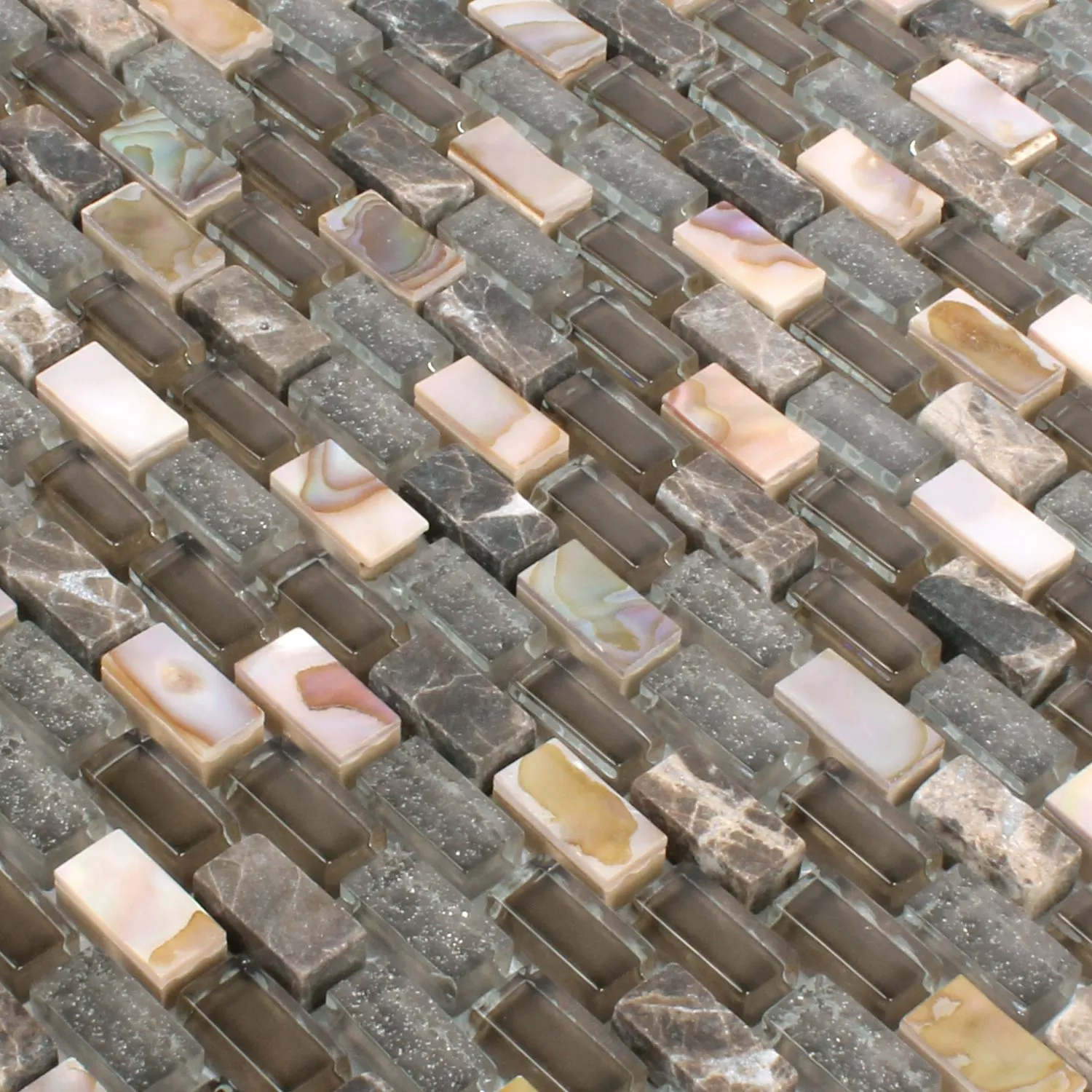 Los mosaicos modernos en el baño ofrecen muchas opciones para hacer que los pisos y las paredes sean visualmente atractivos. Los azulejos de baño de diseño exclusivo Jasmina conchas de piedra natural en marrón oscuro, que están hechos de diferentes materiales como un mosaico de vidrio, inspiran como azulejos de pared con un aspecto único y hermoso. La alternancia de baldosas de piedra natural y mosaico de vidrio asegura un brillo sutil en cada incidencia de la luz. Los mosaicos están hechos de vidrio, piedras naturales de canteras de mármol y conchas reales.