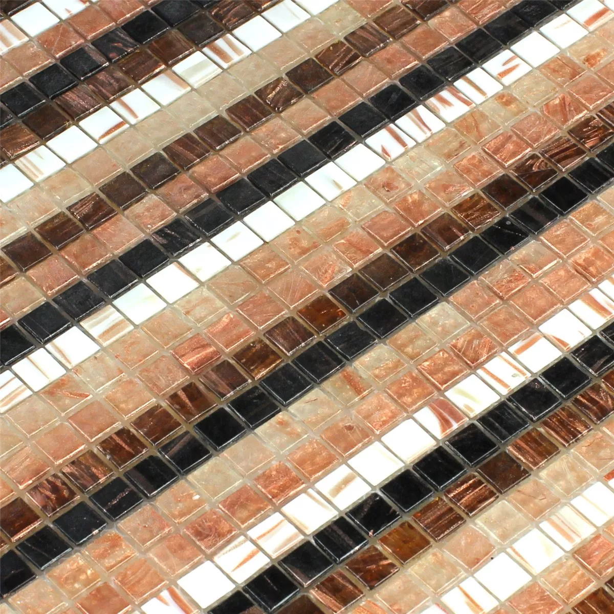 Este mosaico de vidrio en diferentes colores alternados es ideal para el diseño creativo y el revestimiento decorativo de paredes, por lo que son posibles opciones de diseño individuales en baños, cocinas, piscinas, columnas y en la zona de bienestar. Está pegado a una red, por lo que puede procesarse fácilmente y cortarse individualmente.