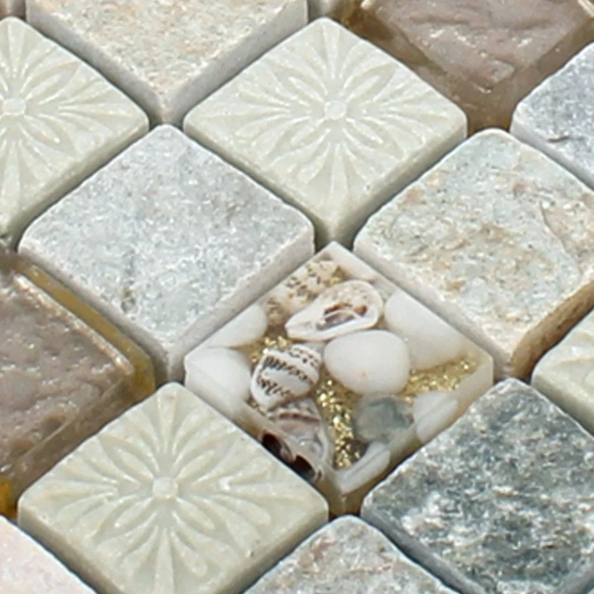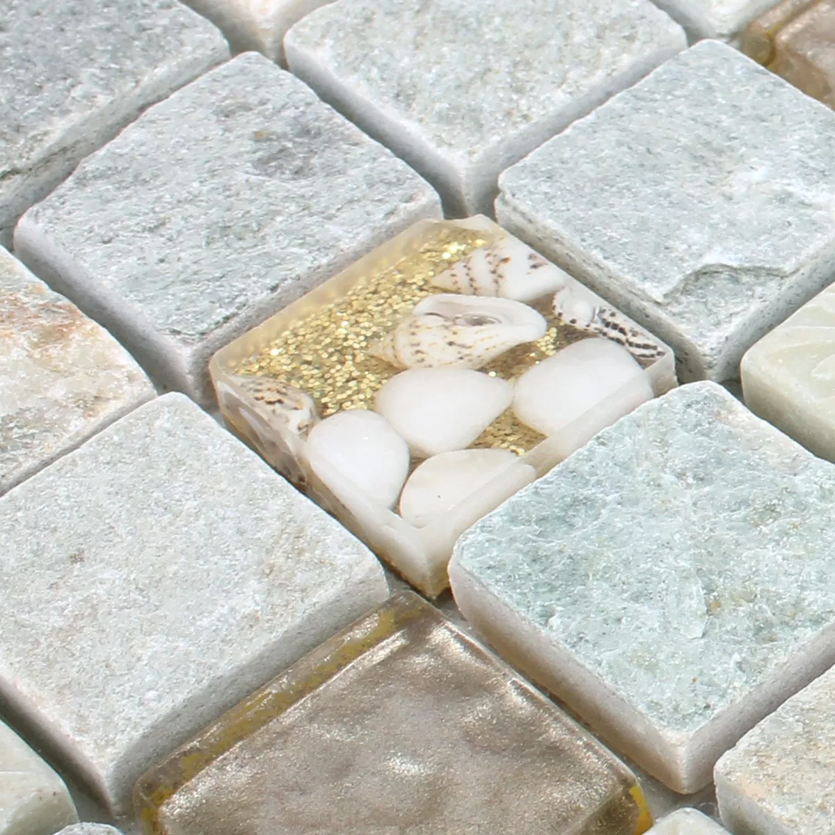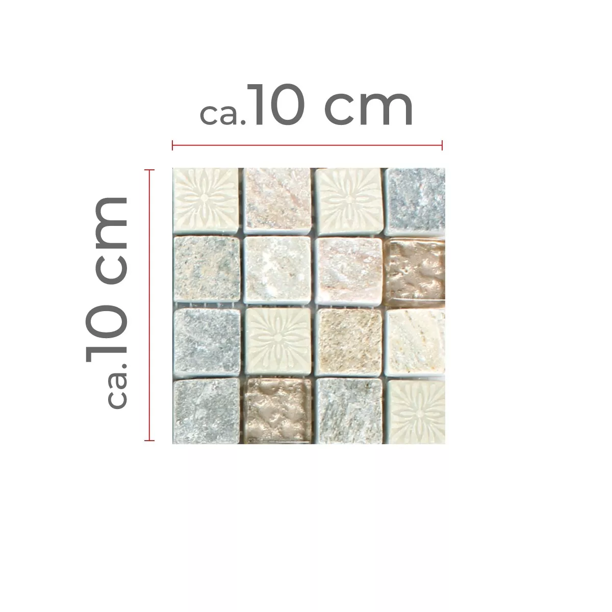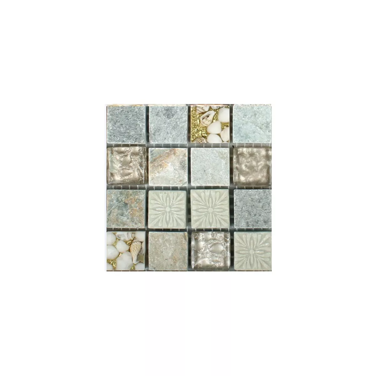 Harmonia Gold Beige ya da una impresión de estos mosaicos colocados sobre esteras para que la colocación se pueda realizar muy fácilmente. Los diferentes materiales y la mezcla de colores de la cuarcita natural con el vidrio crean muy buenas superficies que impresionan visualmente a todos los espectadores. La naturalidad combinada con mosaicos de vidrio brillante dan como resultado un aspecto natural en la superficie que presenta su apariencia de una manera muy noble. Además, las piedras estructurales son muy divertidas con su patrón y eso da una maravillosa impresión general. Estos mosaicos cautivan a todos como revestimiento de paredes.