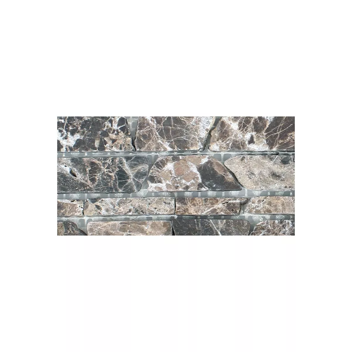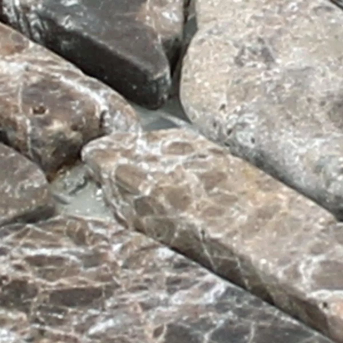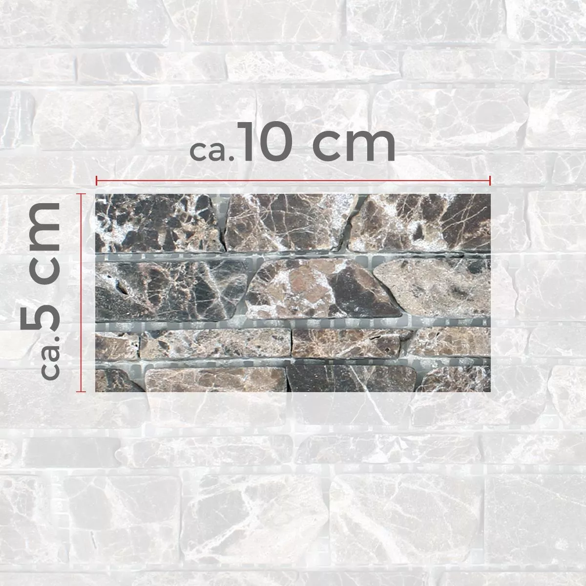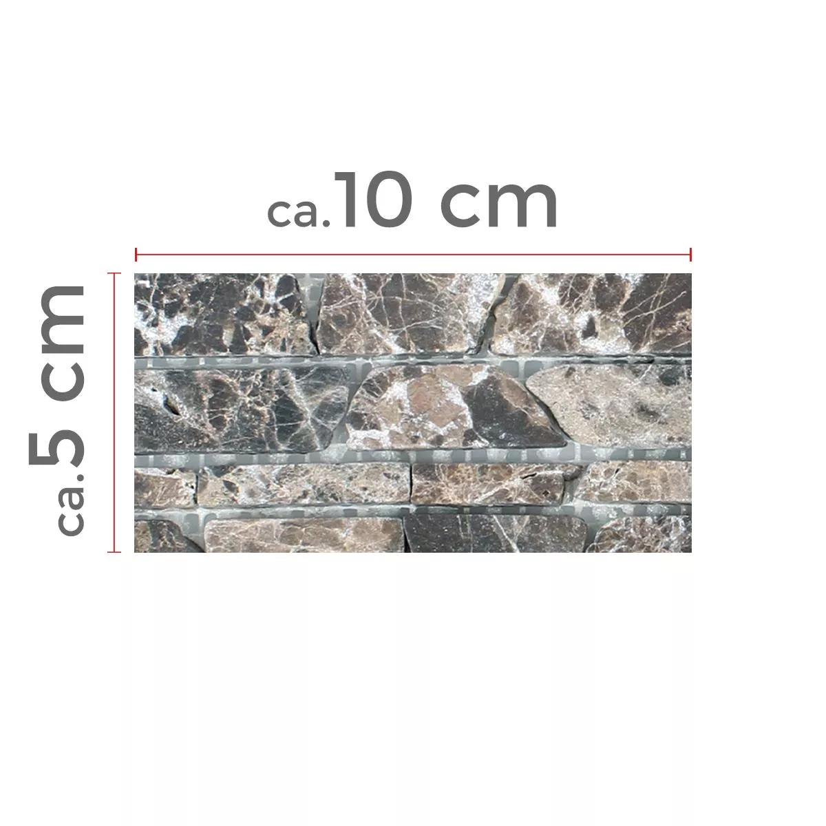 Las pequeñas piedras de mármol de los mosaicos están sobre una base de metal. Las piedras son muy irregulares de 25 a 105 mm de largo x 15 x 7 mm. Los mosaicos están sobre un tapete de 27,5 x 30 cm. La base tiene un grosor de 4 mm. La superficie está cepillada. Similares a las baldosas naturales, tienen un aspecto mate. Los azulejos del baño nunca parecen aburridos, ya que ofrecen interesantes contrastes a través de las inclusiones y las líneas finas, así como los mosaicos irregulares.