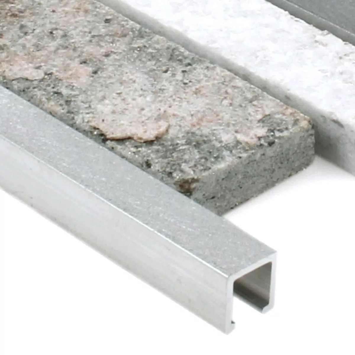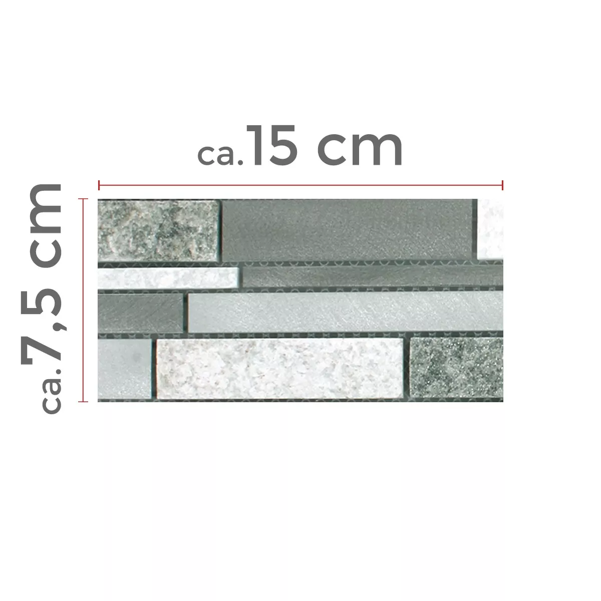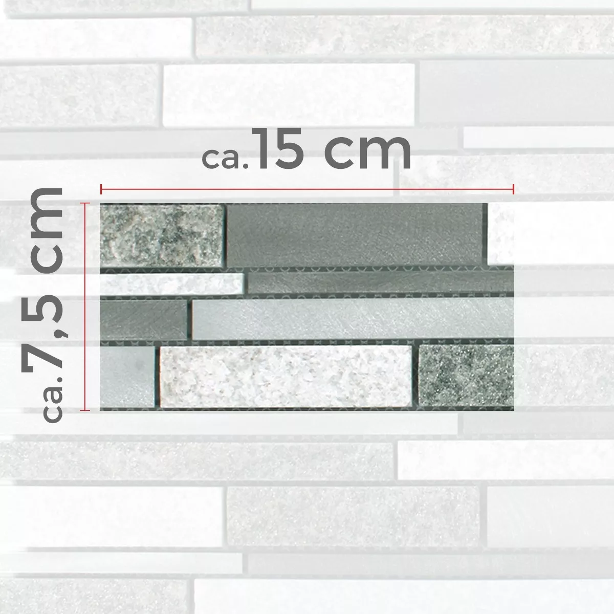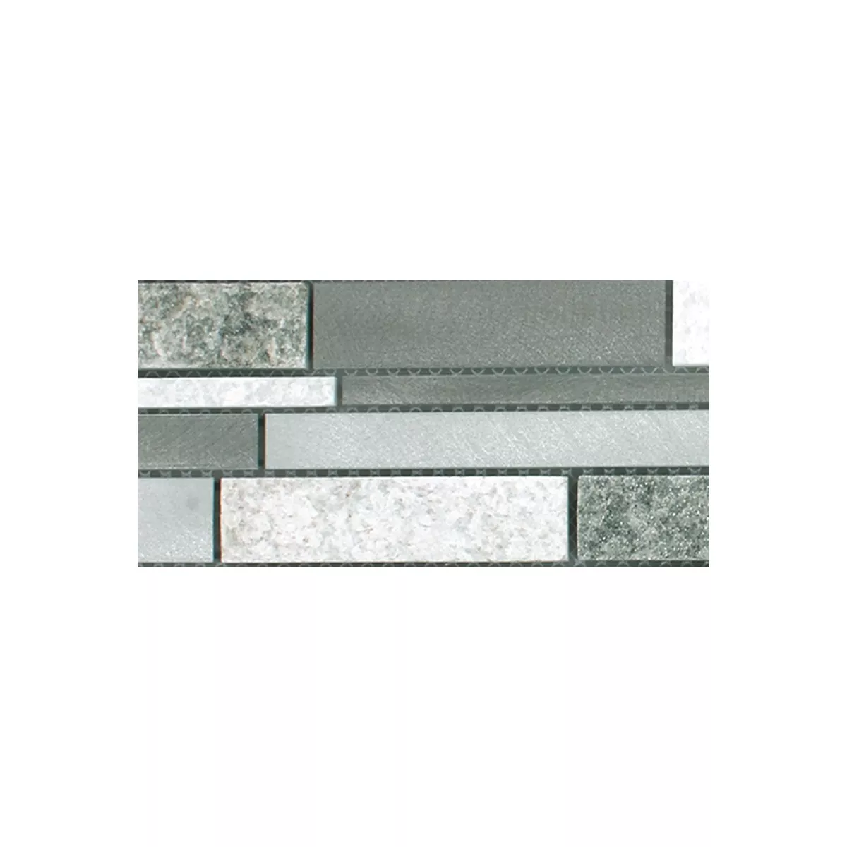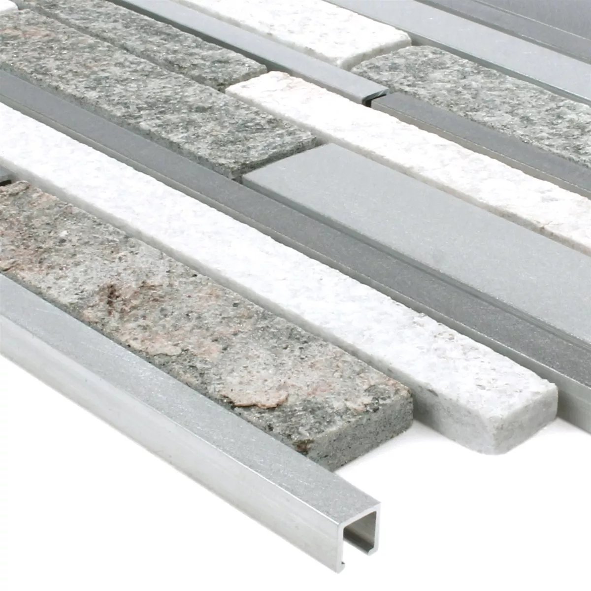 Este producto con su superficie mate y estructurada, que nunca aburre, es muy variable, ya que todos los componentes se pueden procesar de forma muy individual. El aluminio se añade a estos mosaicos en forma de tiras y la mezcla de cuarcita resulta a gusto del cliente. Esto crea un patrón de mosaico de estos mosaicos, que se ven únicos y de muy alta calidad. Esto hace que este producto sea fascinante y ofrece una muy buena propuesta de venta única. También es destacable la atrevida mezcla de metal y un producto muy natural, porque la cuarcita utilizada aquí también muestra una estructura auténtica como mosaicos.