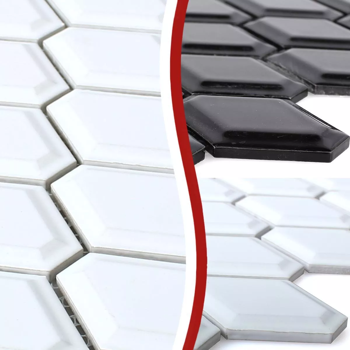 Los mosaicos están hechos de la mejor cerámica. Las piezas han sido cortadas a máquina y tienen exactamente la misma forma y longitud. Durante el procesamiento, a las piedras se les dio la forma de rombos, con las esquinas estrechas dobladas y formando así una esquina de 6. Los bordes están redondeados en ángulo, lo que da como resultado una gran elevación en forma de diamante en el medio. Este bisel le da a los mosaicos un efecto 3D, dependiendo de cómo se coloquen y se muestren. Dependiendo de la elección del color, la superficie es mate o brillante. Las piedras están en los colores blanco mate/brillante y negro mate/brillante. Los azulejos se pueden utilizar tanto en interiores como en exteriores. Visualmente, se destacan mejor en baños o cocinas. En el exterior quedan bien en balcones, terrazas o en el jardín como adorno o cenefa.