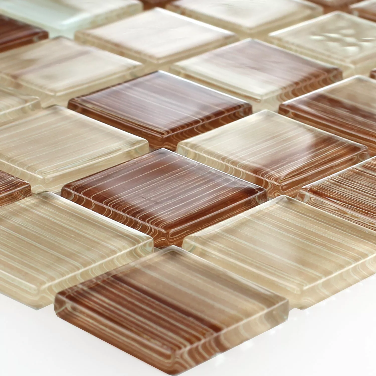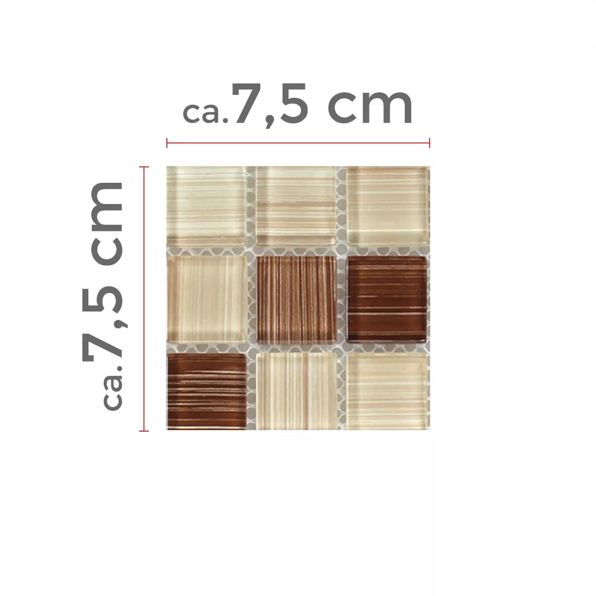 Este mosaico de vidrio cuadrado ópticamente encantador es ideal para el diseño creativo de baños, cocinas, salas de estar, piscinas y áreas de bienestar. Este mosaico impresiona con su combinación de colores única de marrón y beige y un patrón de rayas que le da a la superficie un efecto lúdico. El tamaño de la estera de este mosaico es de 30,5x32,5 cm, las teselas individuales tienen un tamaño de 2,5x2,5 cm y un grosor de 0,4 cm. El mosaico de vidrio está pegado a una estera, lo que contribuye muy bien a un fácil procesamiento.