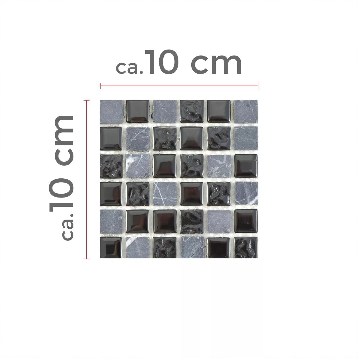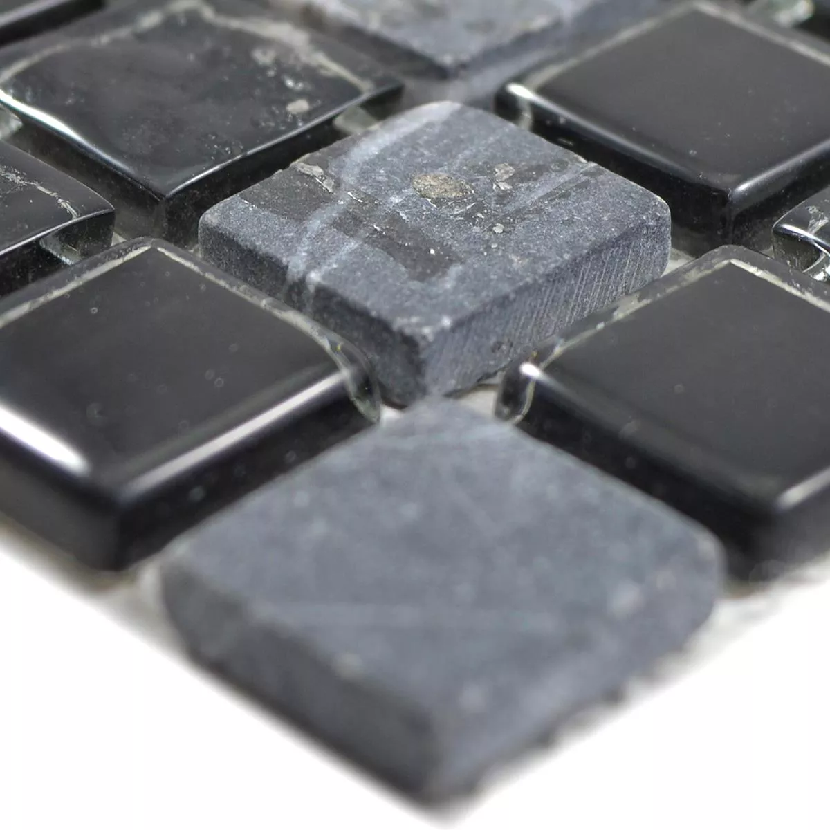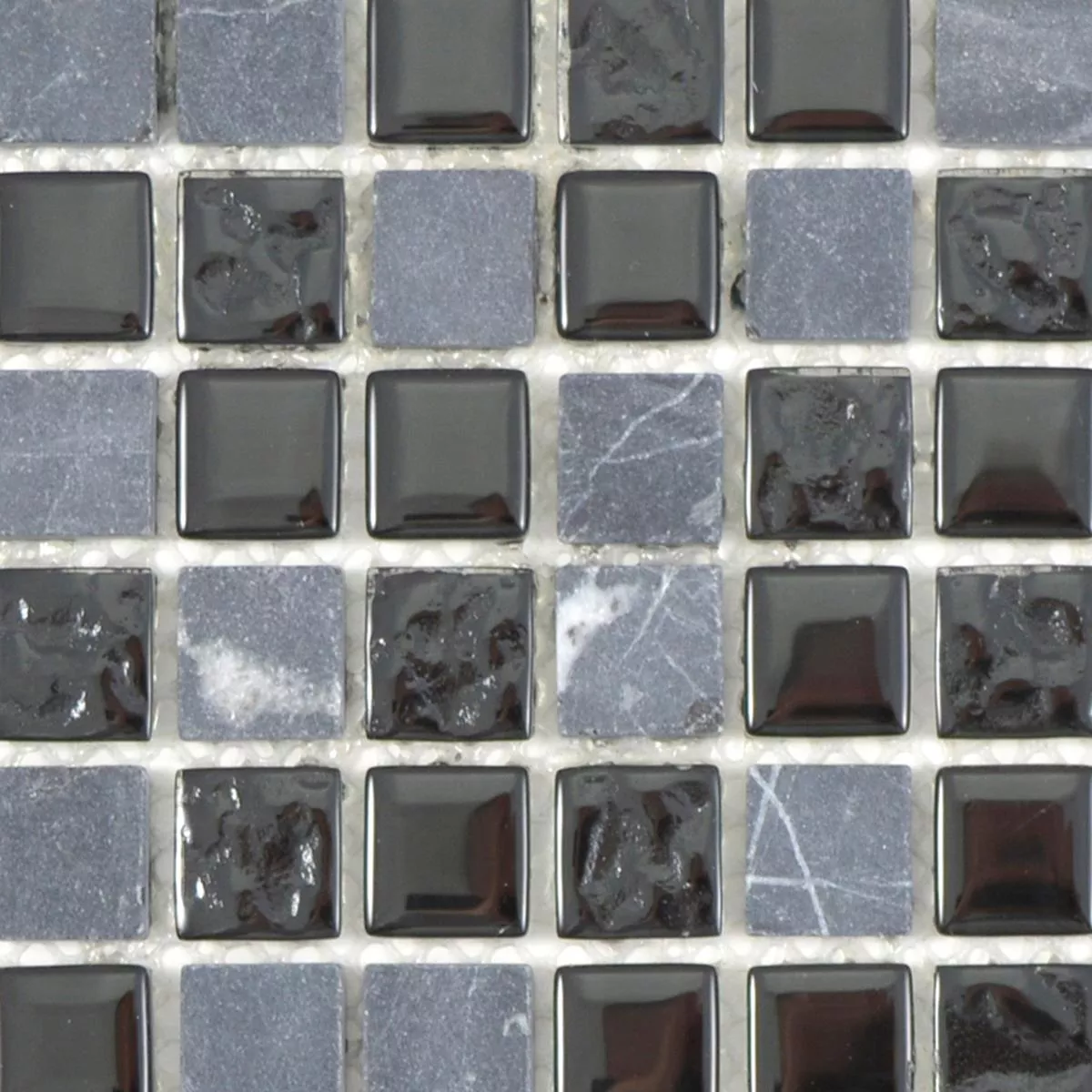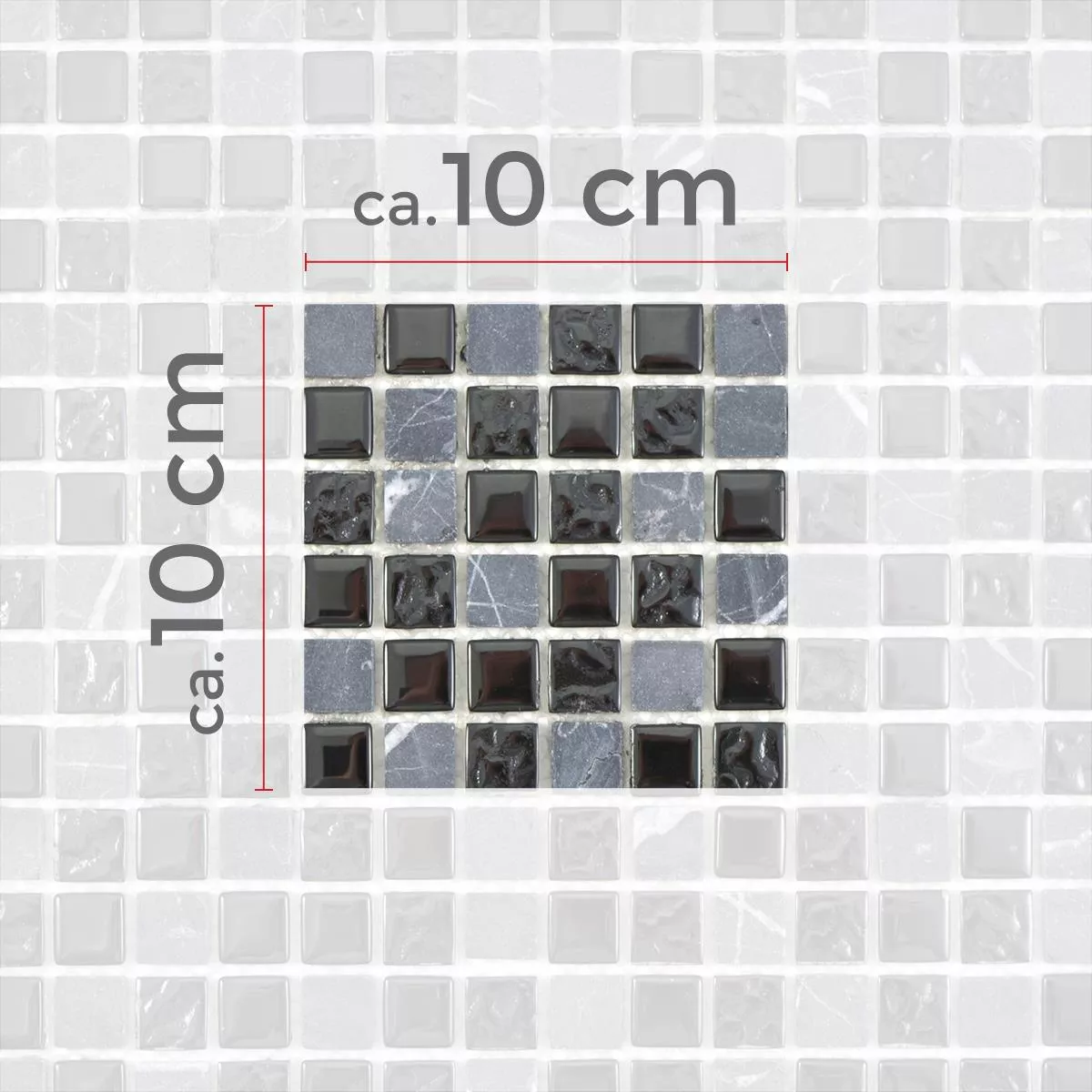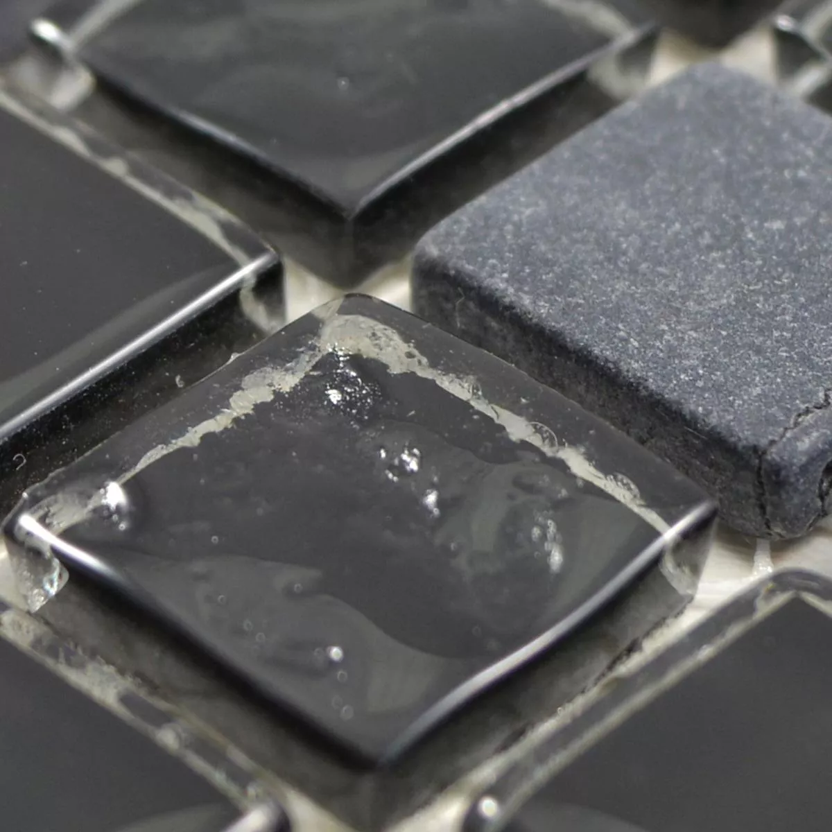 Los mosaicos de piedra natural de vidrio Zekova en la variante de color gris negro se componen alternativamente de mármol y vidrio. El mosaico de piedra natural de vidrio Zekova tiene un tamaño de piedra de 15 x 15 mm. Además, las piedras tienen alternativamente una superficie mate y brillante.