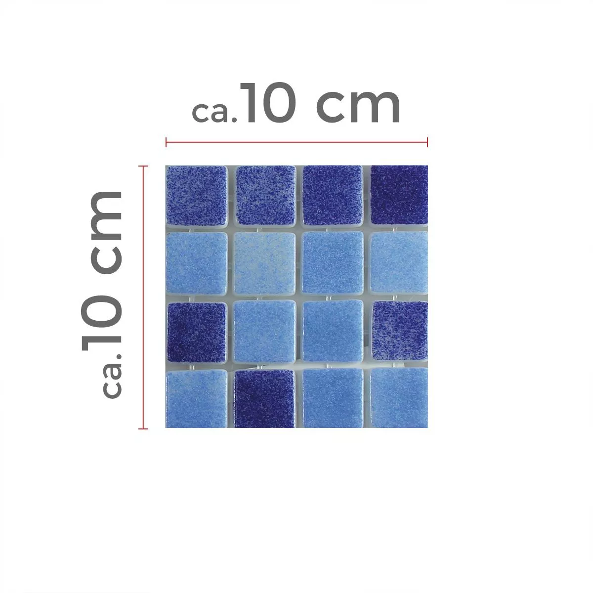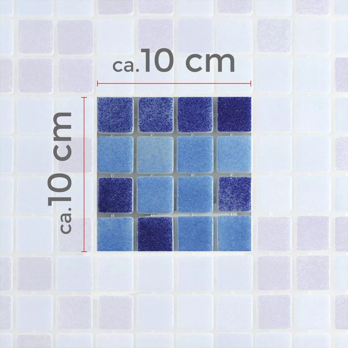 Los mosaicos de vidrio cuadrados Antonio en los colores azul oscuro, azul claro, azul cielo, turquesa, blanco y azul mixto son adecuados para zonas húmedas.