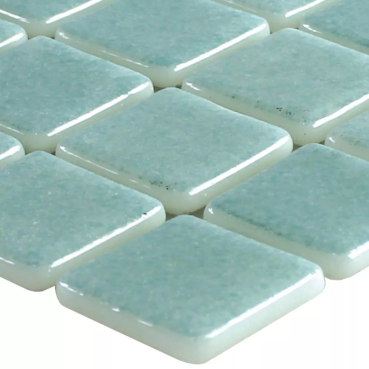 Los mosaicos de vidrio cuadrados Antonio en los colores azul oscuro, azul claro, azul cielo, turquesa, blanco y azul mixto son adecuados para zonas húmedas.