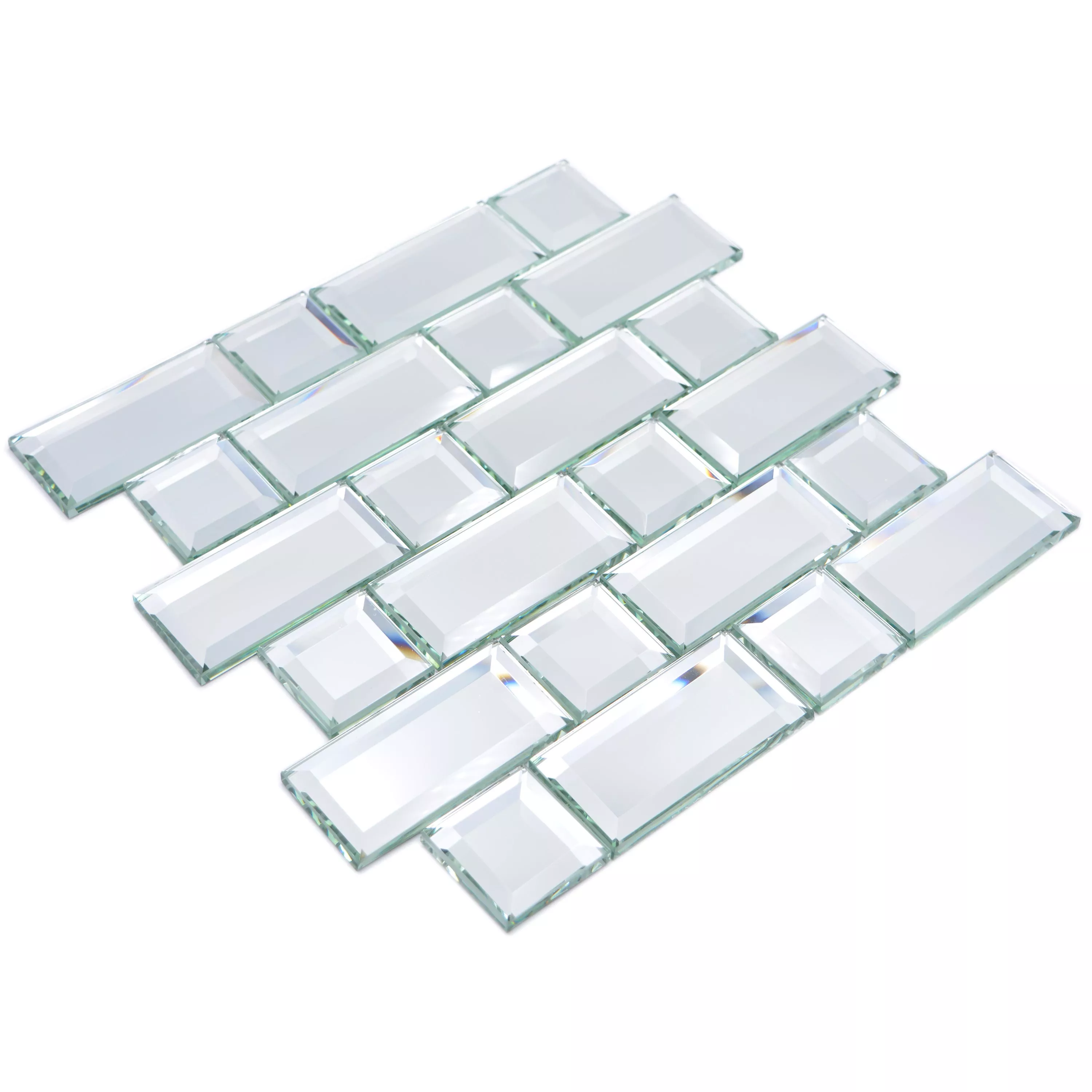 Los mosaicos están en formato de 2 mezclas, el grosor de los paneles de mosaico es de 8 mm. El azulejo está hecho de vidrio y ofrece una superficie de espejo con mosaico. Todas las habitaciones en las que se procesan las baldosas Mirror Metro Mosaic parecen más luminosas y acogedoras que antes. Los mosaicos de vidrio son especialmente adecuados para baños y pasillos, por ejemplo. Parte de la superficie de la pared con el azulejo también podría destacarse en dormitorios grandes.