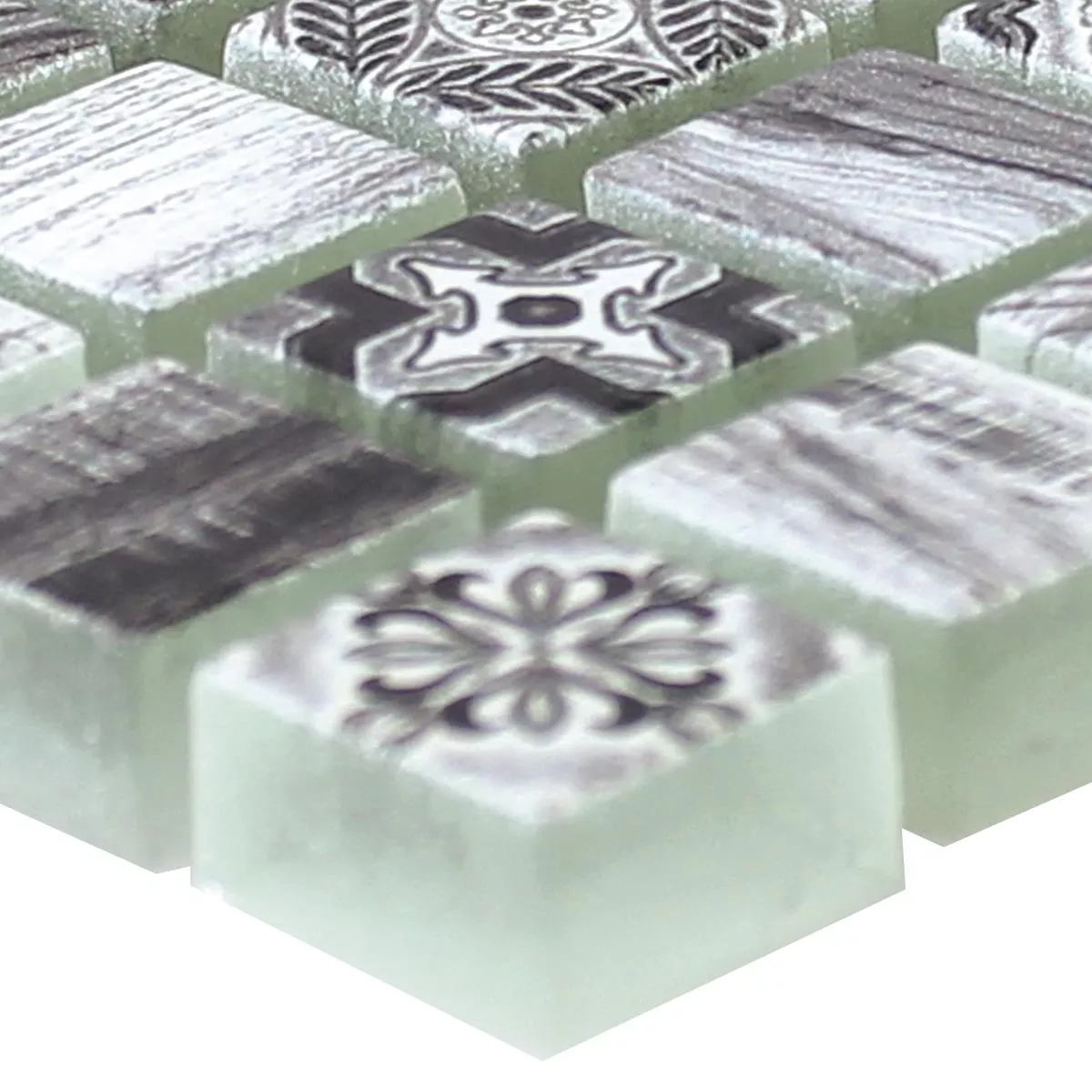 El azulejo con aspecto de madera Vision está hecho de vidrio. La pequeña piedra de forma cuadrada tiene un tamaño de 15 x 15 milímetros y un grosor de 8 milímetros. Su superficie tiene un brillo mate natural y se caracteriza por una estructura uniforme. La baldosa con aspecto de madera de la serie Vision también se puede limpiar y mantener de forma rápida y sencilla. El azulejo con aspecto de madera está cuidadosamente pegado a finas esteras, lo que facilita la colocación.