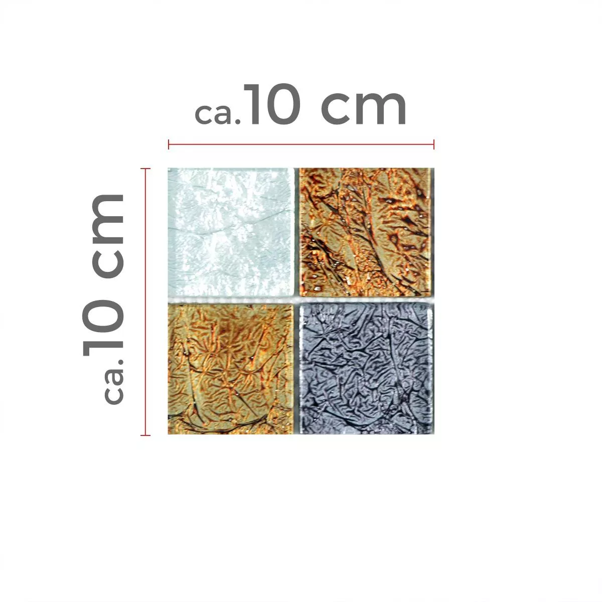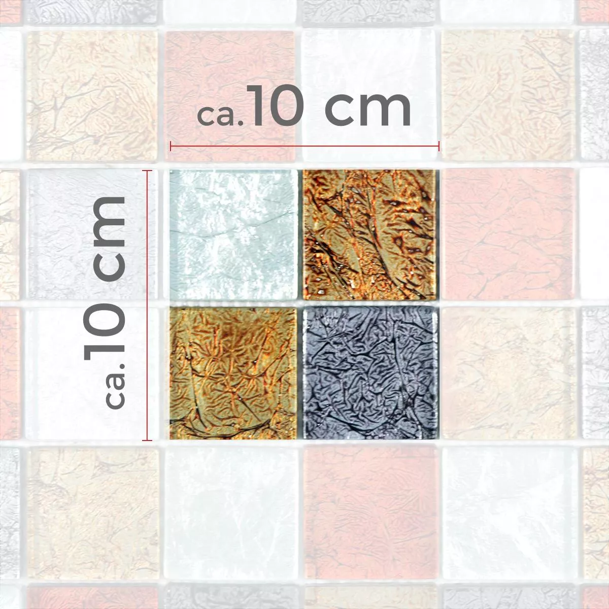 El azulejo tiene un grosor de estera de 8 mm y se puede comprar en varios tamaños de piedra y compuesto. Si está interesado en los mosaicos nobles con mosaico de vidrio, puede elegir entre cuadrados con tamaños de piedra de 23 x 23 mm, 48 x 48 mm, una mezcla de 23 x 23 mm y 48 x 48 mm, así como tamaños compuestos de 15 x 48 mm, 15x98 mm, 15x148 mm y 15x198 mm. El tamaño de la alfombra en sí es de 30 x 30 cm.