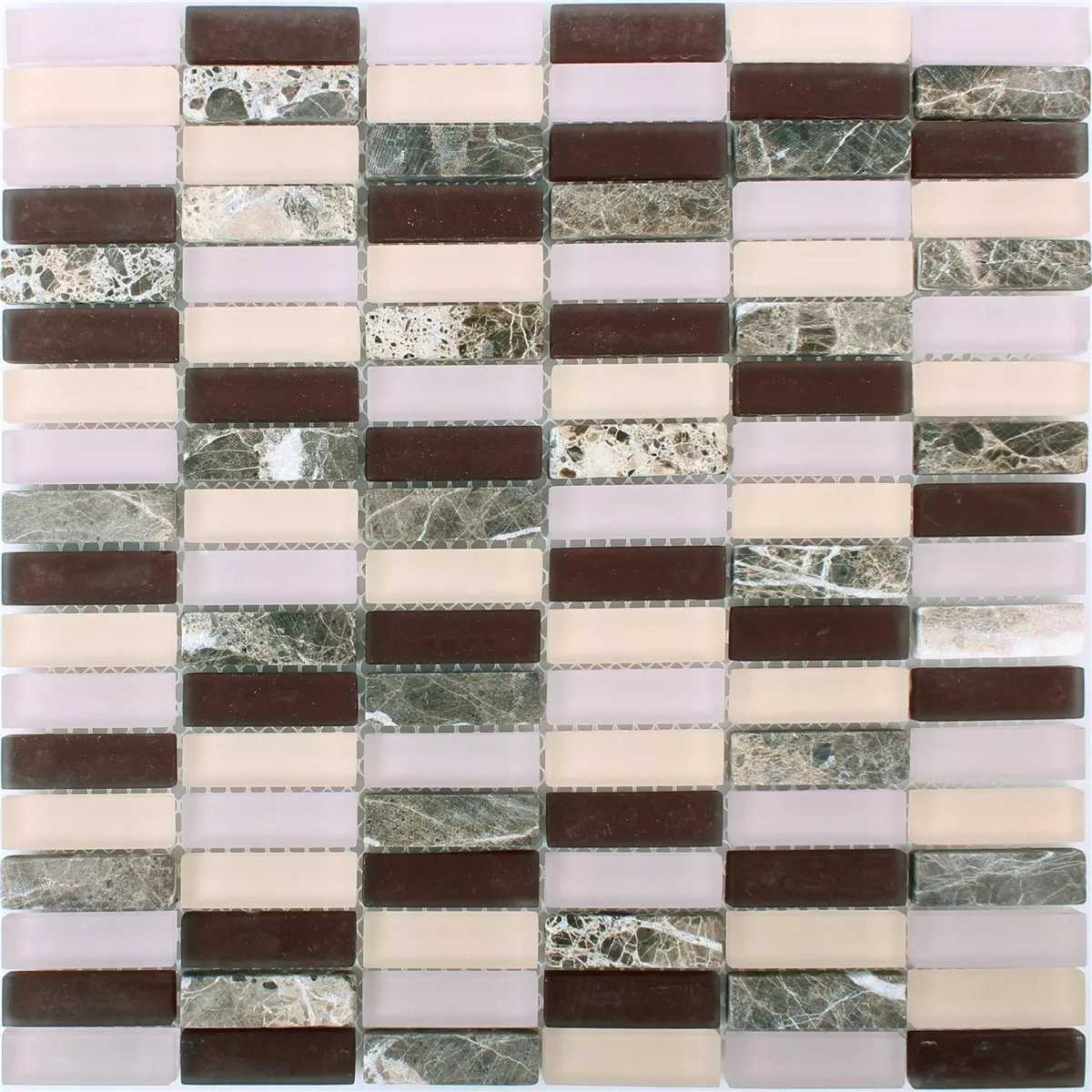 Los mosaicos de vidrio de piedra natural Conrad tienen piedras en los colores violeta, marrón, beige y burdeos. El tamaño de la piedra es de 15x50mm. El producto consiste en una combinación fascinante de los materiales vidrio y piedra natural. Las piedras de 8 mm de espesor se unen a una estera de 30x30 cm, para que puedan colocarse fácil y cómodamente.