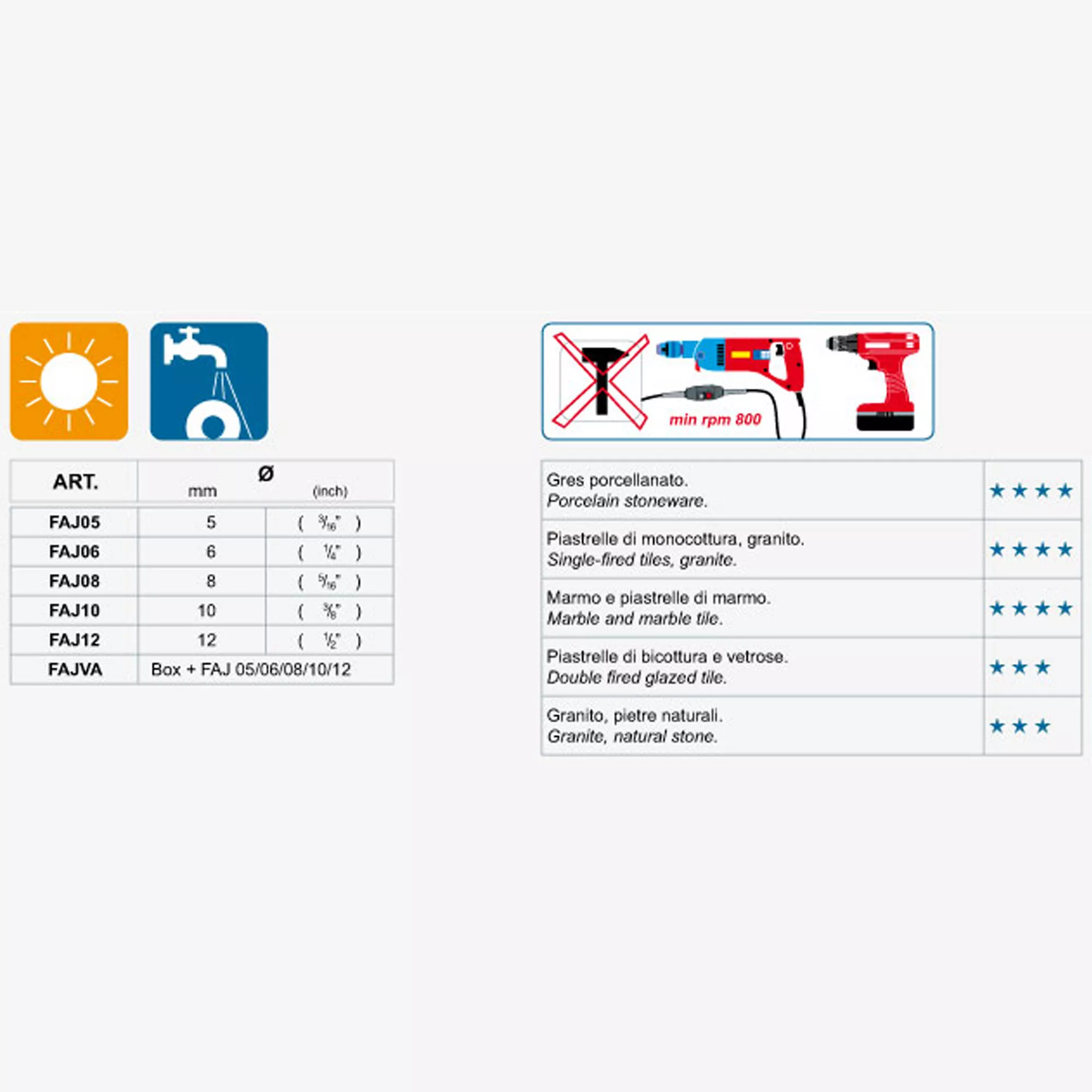 Si desea utilizar la broca de diamante, necesita un taladro con al menos 800 rpm o más. La broca de diamante Mondrillo está disponible en 5 tamaños diferentes. El cliente podrá elegir entre diámetros de 5, 6, 8, 10 y 12 mm. Las herramientas diamantadas como ésta se consideran particularmente duras y están diseñadas para una amplia variedad de trabajos. Si bien esta herramienta de diamante es adecuada para perforación en seco, existen otras herramientas que se pueden utilizar para perforación en húmedo. Al comprar una broca y una herramienta de diamante, debe prestar atención a la alta calidad y a un acabado impecable. La herramienta aquí presentada debe utilizarse con un taladro adecuado o compatible.