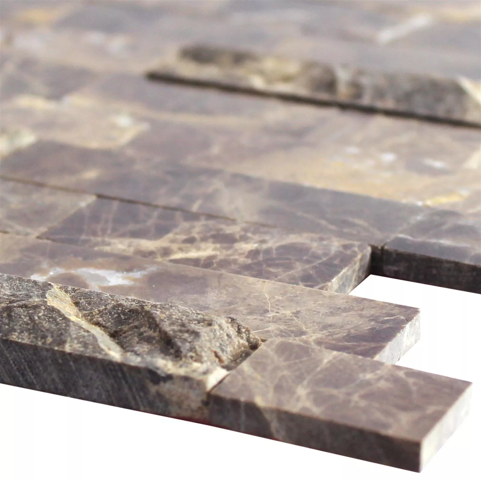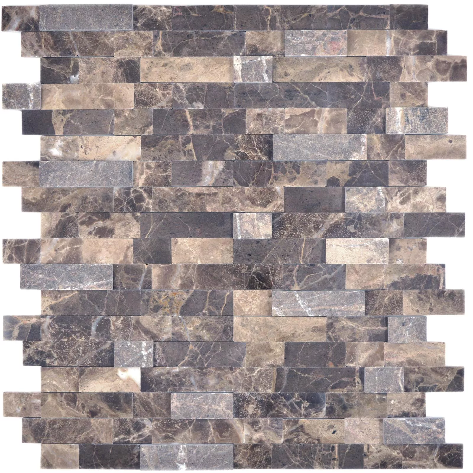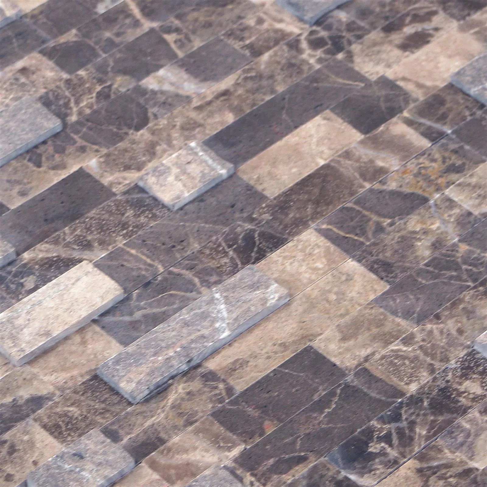 Los bonitos azulejos con aspecto de piedra están dispuestos en formato de barra y, por supuesto, están disponibles como tapete. La instalación es muy fácil y solo requiere una superficie de pared limpia y uniforme. La superficie de las alfombrillas de baldosas está disponible en brillo y mate. El espesor puede estar disponible en 4 mm o 6 mm. Aquí depende de si el mosaico tiene un efecto 3D. Las baldosas de mármol son de color marrón y están pensadas para uso en interiores y se pueden instalar en estancias como pasillos, cocinas y similares.