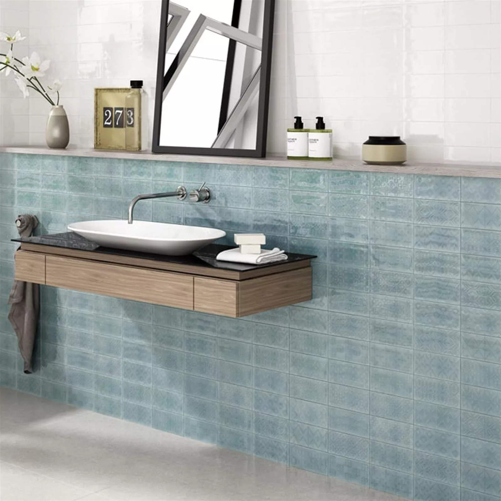 El revestimiento de pared London en color turquesa está fabricado en loza esmaltada y está disponible en el formato 7,5x15 cm. La superficie es ligeramente ondulada y brillante.