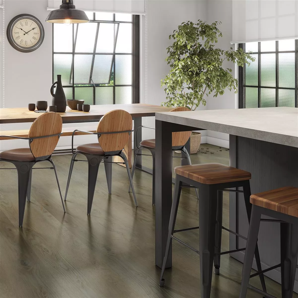 El suelo vinílico con sistema Click Hollywood en color marrón cálido confiere a sus habitaciones un aspecto acogedor y elegante atemporal. Este suelo de alta calidad combina un atractivo aspecto de madera con el confort moderno para crear una atmósfera acogedora.