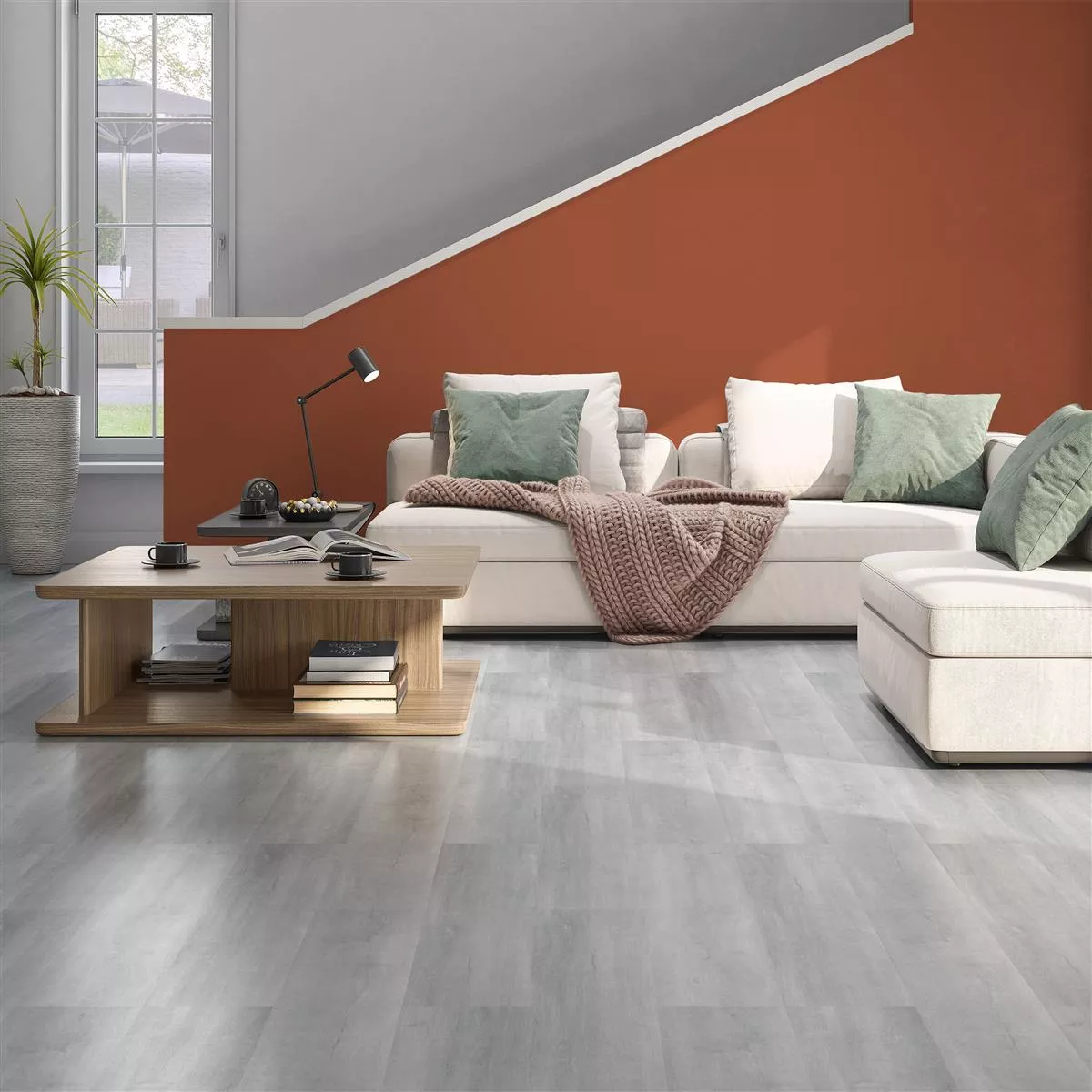 El suelo vinílico Snowwood en gris y blanco aporta un aspecto de madera fresco y moderno a tus habitaciones y lo combina con las ventajas prácticas del vinilo. Con un espesor de 5 mm y un formato rectangular de 17,2 cm de ancho y 121 cm de largo, este pavimento no sólo ofrece una atractiva estética, sino también un excepcional confort y durabilidad.